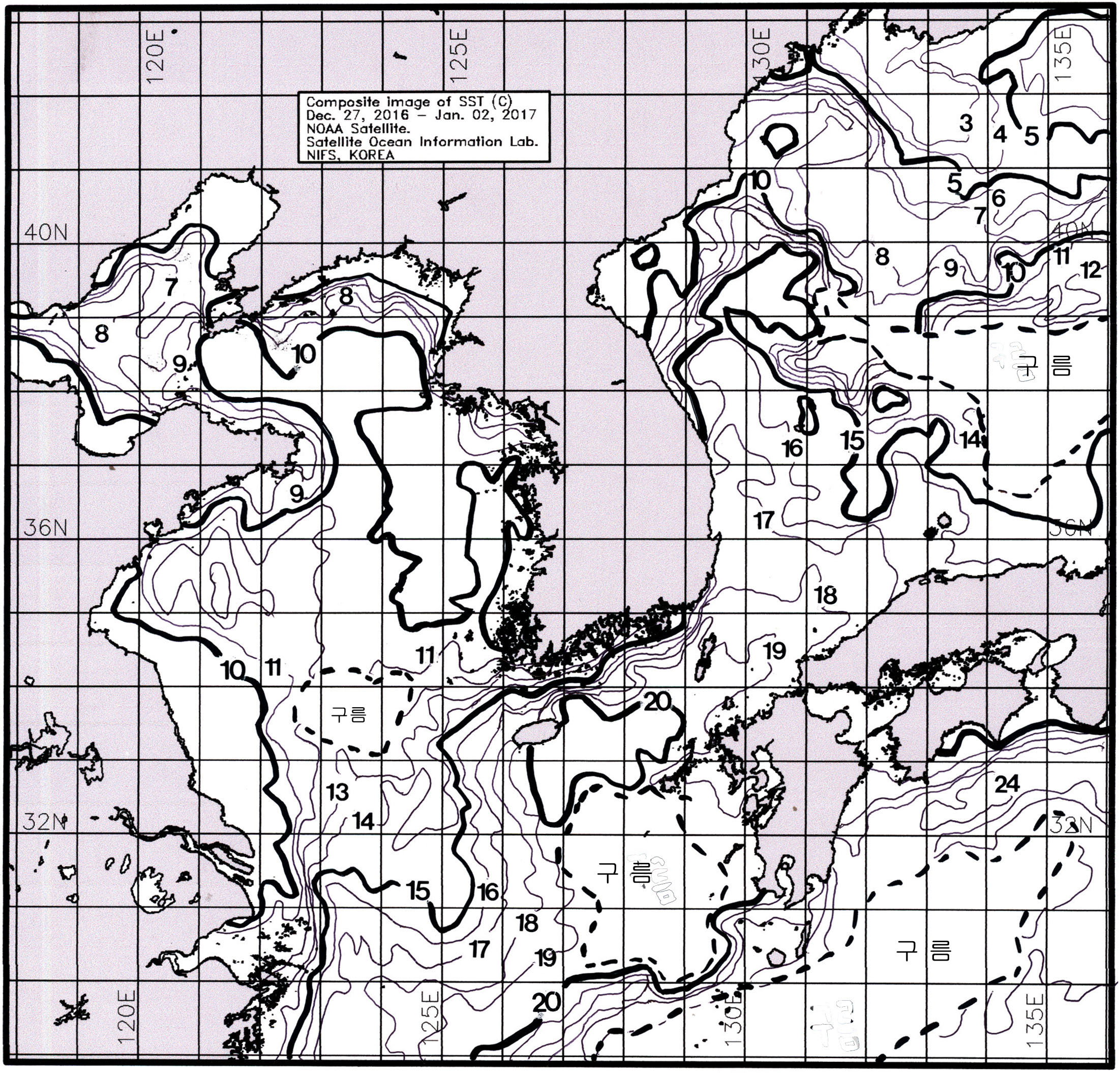 ◦ 금주(2016. 12. 27 ~ 2017. 01. 02)의 한국근해 표면수온은 대화퇴 근해 11~12도, 울릉도-독도 근해 15~16도, 대마도 근해 18~20도, 제주도 근해 18~20도, 이어도 근해 14~15도, 가거초 근해 11~13도, 어청도 근해 9~11도, 백령도 근해 9∼11도로 나타납니다. ◦ 「평년에 비해」대화퇴 근해 0.8도 높게, 울릉도-독도 근해 1.2도 높게, 대마도 근해 1.2도 높게, 제주도 1.6도 높게, 이어도 비슷하게, 가거초 근해 0.8도 낮게, 어청도 근해 0.5도 높게 나타납니다. ◦ 「전년에 비해」대화퇴 근해 비슷하게, 울릉도-독도 근해 2도 높게, 대마도 근해 비슷하게, 제주도 근해 1도 높게, 이어도 근해 1.5도 낮게, 가거초 근해 0.5도 낮게, 어청도 근해 0.5도 낮게, 백령도 근해 0.5도 낮게 나타납니다. ◦ 수온 전선대는 우리나라 제주해협에서 대한해협까지 18도를 중심으로 형성됩니다.