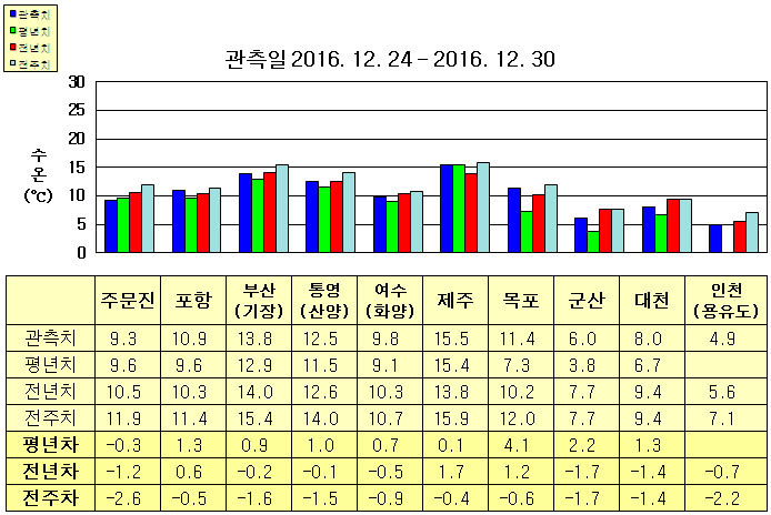◦ 금주(2016. 12. 24 ~ 12. 30)의 한반도 연안 표면수온은 동해 연안역에서 섭씨 9~14도, 남해 연안역 9.5~15.5도, 서해 연안역에서 4.6~11.5도로 나타납니다. ◦ 평년에 비해 주문진 비슷함을 제외한 동해 연안역은 0.5~1.5도 높게, 제주 비슷함을 제외한 남해 연안역은 0.5~1.0도 높게, 서해 연안역은 1.5~4.5도 높게 나타납니다. ◦ 전년에 비해 동해 연안역은 주문진 1.2도 낮게, 포항 0.6도 높게, 부산(기장) 비슷하게, 남해 연안역은 통영(산양) 비슷하게, 여수(화양) 0.5도 낮게, 제주 1.7도 높게, 목포 1.2도 높음을 제외한 서해 연안역은 0.5~2.0도 낮게 나타납니다.