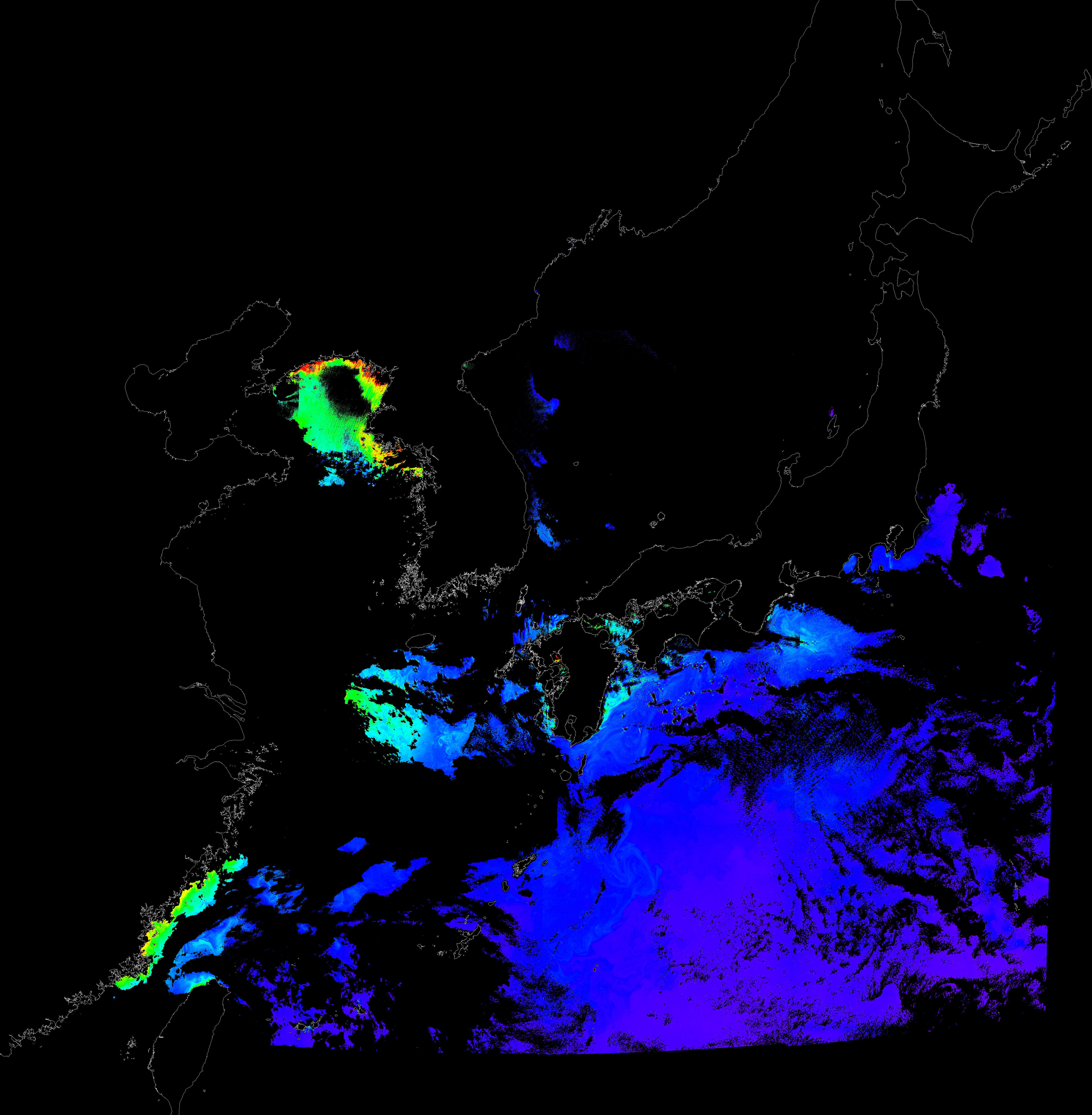 o 2017년 01월 04일 천리안 GOCI 클로로필 a 위성영상입니다.