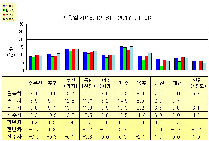 ◦ 금주(2016. 12. 31 ~ 2017. 01. 06)의 한반도 연안 표면수온은 동해 연안역에서 섭씨 9~14도, 남해 연안역 9.5~15.5도, 서해 연안역에서 5.5~9.5도로 나타납니다. ◦ 평년에 비해 주문진 비슷함을 제외한 동해 연안역은 1.0~1.5도 높게, 남해 연안역은 0.5~2.0도 높게, 서해 연안역은 2~5도 높게 나타납니다. ◦ 전년에 비해 동해 연안역은 주문진 0.7도 낮게, 포항 1.2도 높게, 부산(기장) 비슷하게, 제주 2.2도 높음을 제외한 남해 연안역은 비슷하게, 군산 1도 높음, 대천 0.8도 낮음을 제외한 서해 연안역은 비슷하게 나타납니다. |