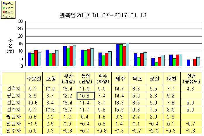 ◦ 금주(2017. 01. 07 ~ 2017. 01. 13)의 한반도 연안 표면수온은 동해 연안역에서 섭씨 9.0~13.5도, 남해 연안역 9~15도, 서해 연안역에서 4~9도로 나타납니다. ◦ 평년에 비해 주문진 비슷함을 제외한 동해 연안역은 0.5~2.5도 높게, 제주 비슷함을 제외한 남해 연안역은 0.5~2.0도 높게, 서해 연안역은 2.5~3.0도 높게 나타납니다. ◦ 전년에 비해 동해 연안역은 주문진 1.5도 낮게, 포항 2.5도 높게, 부산(기장) 비슷하게, 남해 연안역은 통영(산양) 0.4도 낮게, 여수(화양) 비슷하게, 제주 1.4도 높게, 목포, 대천 비슷함을 제외한 서해 연안역은 0.5~1.0도낮게 나타납니다. |