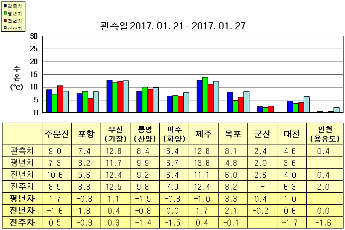 ◦ 금주(2017. 01. 21 ~ 2017. 01. 27)의 한반도 연안 표면수온은 동해 연안역에서 섭씨 7~13도, 남해 연안역 6~13도, 서해 연안역에서 0~8.5도로 나타납니다. ◦ 평년에 비해 포항 0.8도 낮음을 제외한 동해 연안역은 1~2도 높게, 여수(화양) 비슷함을 제외한 남해 연안역은 1.0~1.5도 낮게, 서해 연안역은 0.5~3.5도 높게 나타납니다. ◦ 전년에 비해 주문진 1.6도 낮음을 제외한 동해 연안역은 0.5~2.0도 높게, 남해 연안역은 통영(산양) 0.8도 낮게, 여수(화양) 비슷하게, 제주 1.7도 높게, 목포 2.1도, 대천 0.6도 높음을 제외한 서해 연안역은 비슷하게 나타납니다.
