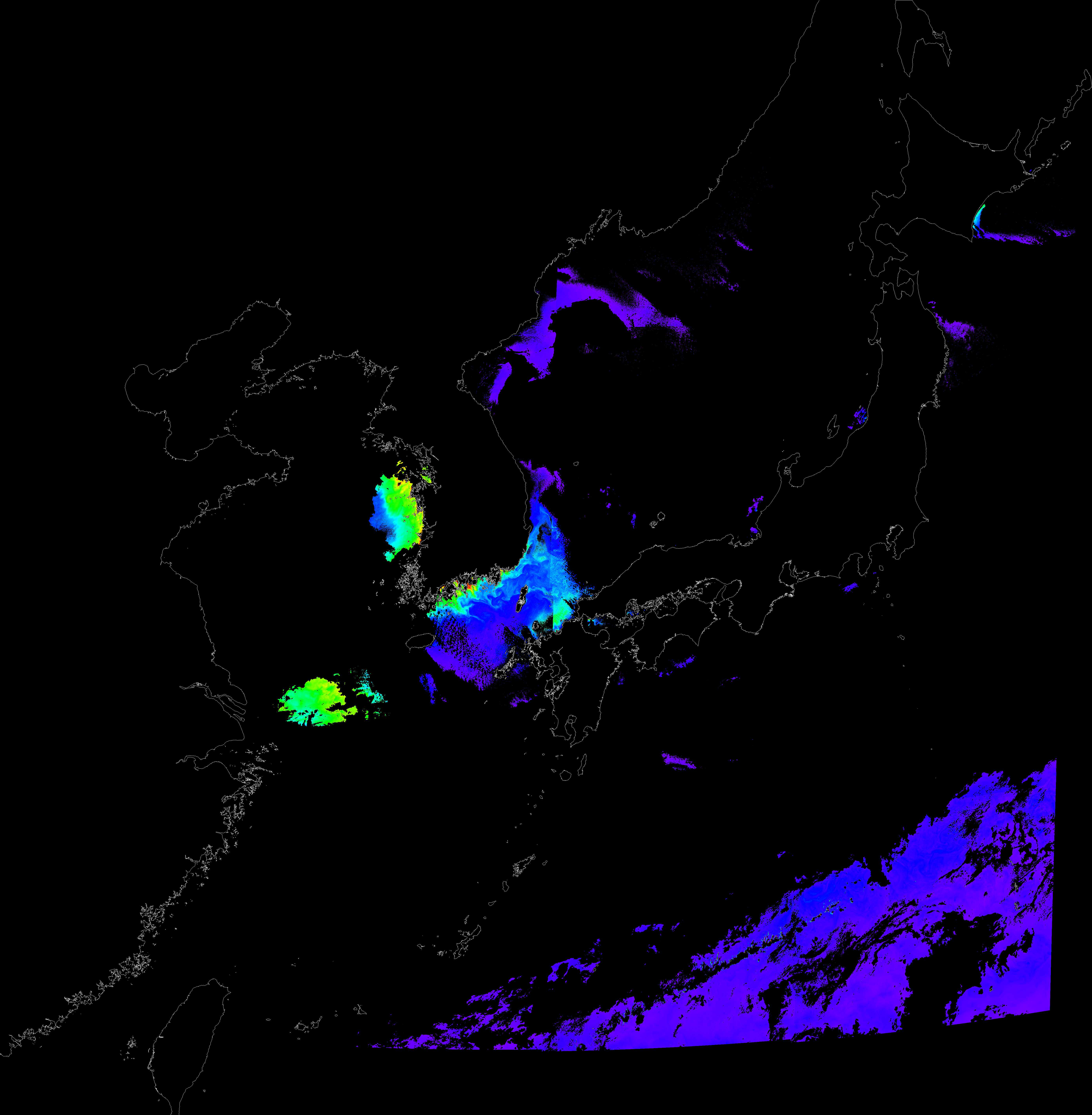 o 2017년 02월 18일 천리안 GOCI 클로로필 a 위성영상입니다.