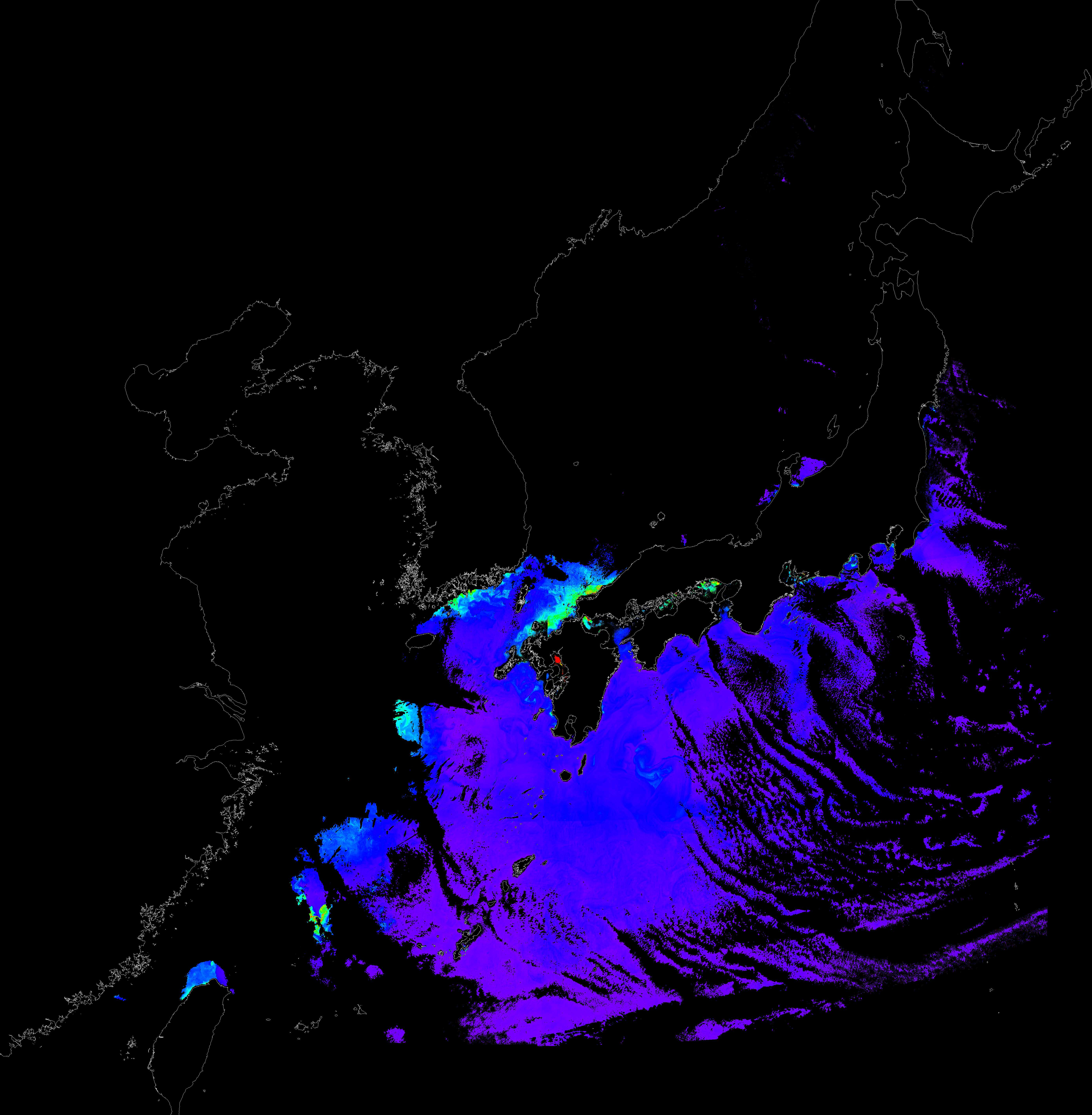 o 2017년 02월 19일 천리안 GOCI 클로로필 a 위성영상입니다.