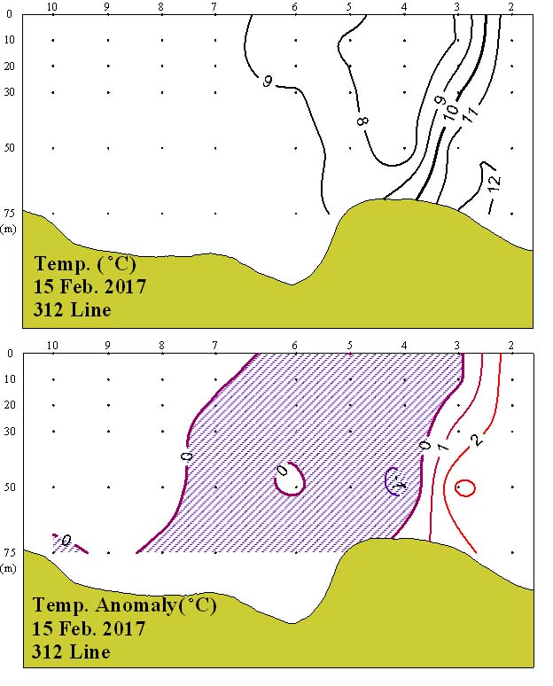 ◦ 2017년 2월 15일 국립수산과학원 서해수산연구소에서 조사한 312선(제주해협 서방)의 수직수온분포도 및 평년편차도입니다.