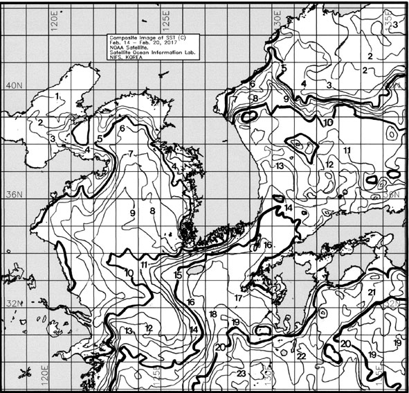 ◦ 금주(2017. 02. 14 ~ 2017. 02. 20)의 한국근해 표면수온은 대화퇴 근해 7~8도, 울릉도-독도 근해 11~12도, 대마도 근해 15~17도, 제주도 근해 15~17도, 이어도 근해 10~11도, 가거초 근해 9~11도, 어청도 근해 5~7도, 백령도 근해 5∼6도로 나타납니다. ◦ 「평년에 비해」대화퇴 근해 0.7도 높게, 울릉도-독도 근해 1.1도 높게, 대마도 근해 1.3도 높게, 제주도 1.5도 높게, 이어도 근해 0.9도 높게, 가거초 근해 비슷하게, 어청도 근해 0.5도 높게 나타납니다. ◦ 「전년에 비해」대화퇴 근해 2.5도 낮게, 울릉도-독도 근해 비슷하게, 대마도 근해 1.5도 높게, 제주도 근해 1.5도 높게, 이어도 근해 0.5도 높게, 가거초 1.5도 낮게, 어청도 근해 2도 낮게, 백령도 근해 0.5도 낮게 나타납니다. ◦ 수온 전선대는 우리나라 제주해협에서 대한해협까지 15도를 중심으로 형성됩니다. |