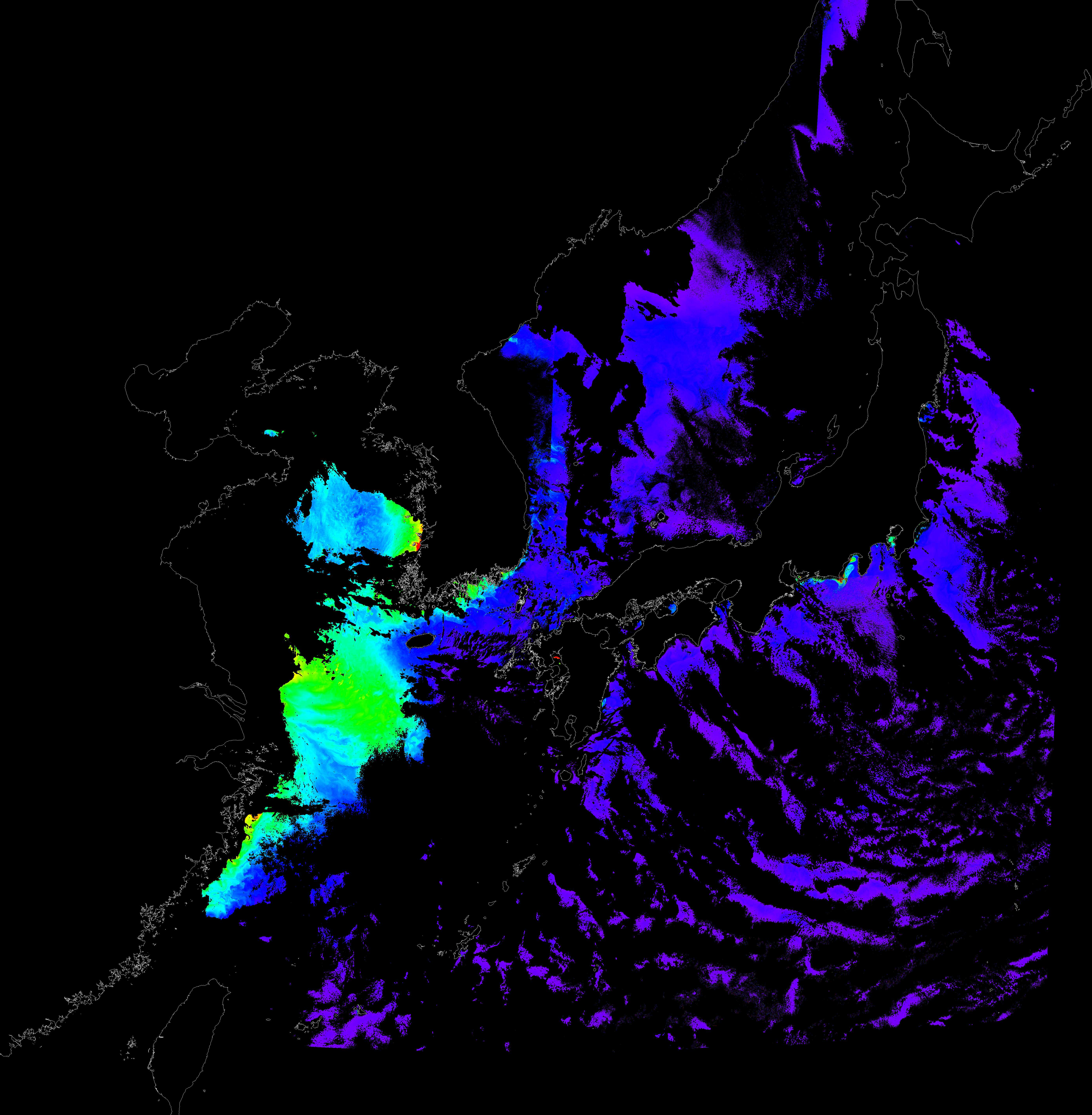 o 2017년 03월 03일 천리안 GOCI 클로로필 a 위성영상입니다.