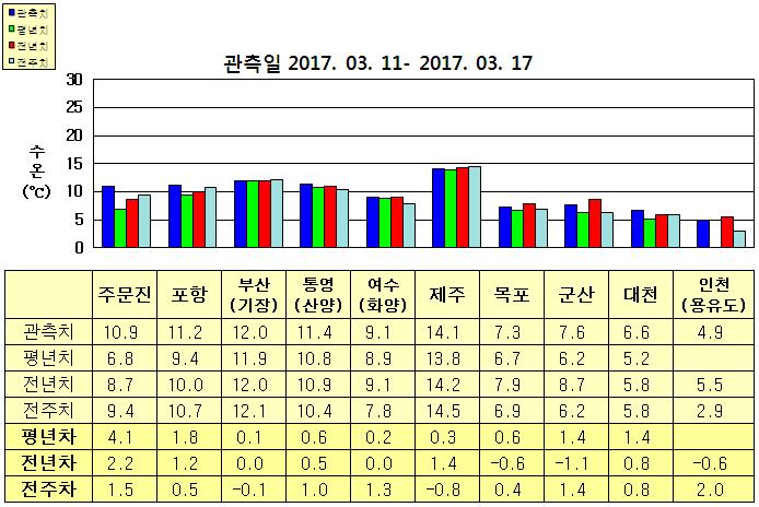 ◦ 금주(2017. 03. 11 ~ 2017. 03. 17)의 한반도 연안 표면수온은 동해 연안역에서 섭씨 10.5~12도, 남해 연안역 9~14.5도, 서해 연안역에서 5~7.5도로 나타납니다. ◦ 평년에 비해 기장 비슷함을 제외한 동해 연안역은 1.5~4도 높게, 통영 0.6도 높음을 제외한 남해 연안역은 비슷하게, 서해 연안역은 0.5~1.5도 높게 나타납니다. ◦ 전년에 비해 기장 비슷함을 제외한 동해 연안역은 1~2.5도 높게, 여수 비슷함을 제외한 남해 연안역은 0.5~1.5도 높게, 대천 0.8도 높음을 제외한 서해 연안역은 0.5~1.5도 낮게 나타납니다. |