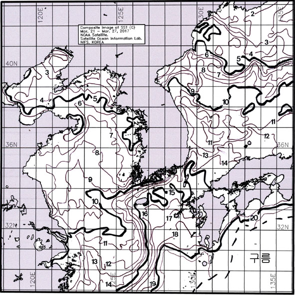 ◦ 금주(2017. 03. 21 ~ 2017. 03. 27)의 한국근해 표면수온은 대화퇴 근해 7~9도, 울릉도-독도 근해 11~12도, 대마도 근해 14~15도, 제주도 근해 14~16도, 이어도 근해 9~10도, 가거초 근해 8~10도, 어청도 근해 5~6도, 백령도 근해 4∼5도로 나타납니다. ◦ 「평년에 비해」대화퇴 근해 0.4도 높게, 울릉도-독도 근해 1.1도 높게, 대마도 근해 비슷하게, 제주도 0.7도 높게, 이어도 근해 비슷하게, 가거초 근해 비슷하게, 어청도 근해 비슷하게 나타납니다. ◦ 「전년에 비해」대화퇴 근해 3.5도 낮게, 울릉도-독도 근해 0.5도 높게, 대마도 근해 1도 낮게, 제주도 근해 1도 낮게, 이어도 근해 비슷하게, 가거초 근해 비슷하게, 어청도 근해 비슷하게, 백령도 근해 1도 낮게 나타납니다. ◦ 수온 전선대는 우리나라 제주해협에서 대한해협까지 14도를 중심으로 형성됩니다. |