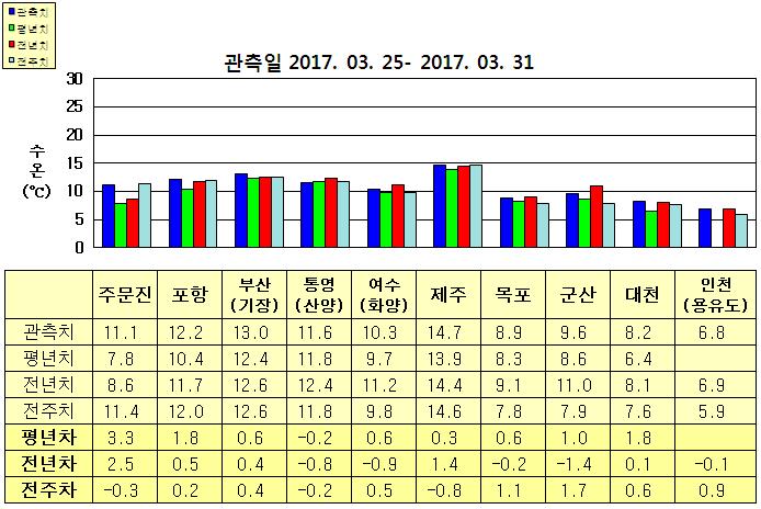 ◦ 금주(2017. 03. 25 ~ 2017. 03. 31)의 한반도 연안 표면수온은 동해 연안역에서 섭씨 11.0~13.0도, 남해 연안역 10.0~15.0도, 서해 연안역에서 6.5~9.5도로 나타납니다. ◦ 평년에 비해 동해 연안역은 0.5~3.5도 높게, 통영 비슷함을 제외한 남해 연안역은 0.5~1도 높게, 서해 연안역은 0.5~2.0도 높게 나타납니다. ◦ 전년에 비해 기장 비슷함을 제외한 동해 연안역은 0.5~2.5도 높게, 제주 비슷함을 제외한 남해 연안역은 0.5~1.0도 낮게, 군산 1.5도 낮음을 제외한 서해 연안역은 비슷하게 나타납니다. =$row[content]?>=$row['content']?> |