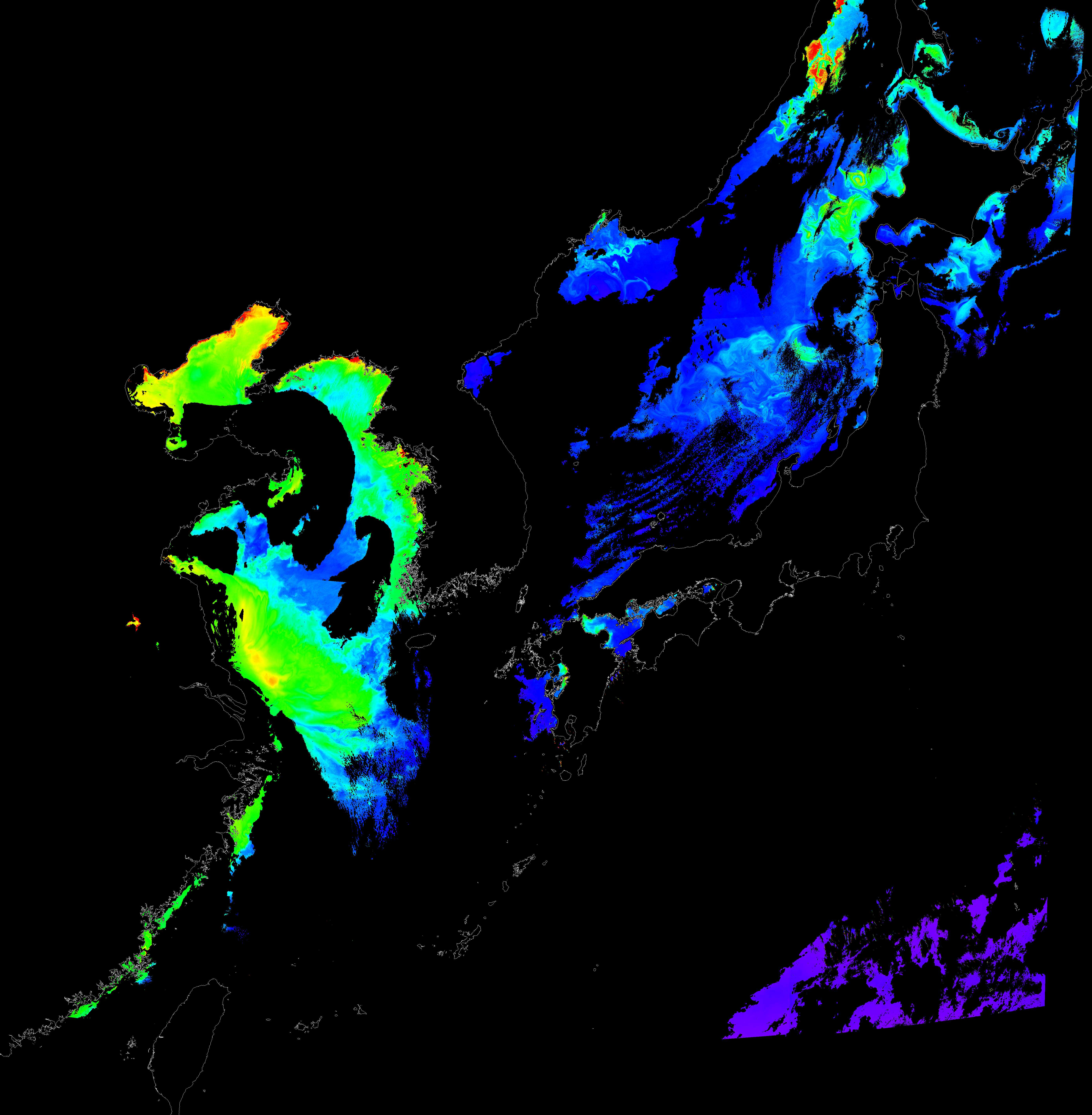 o 2017년 04월 01일 천리안 GOCI 클로로필 a 위성영상입니다.