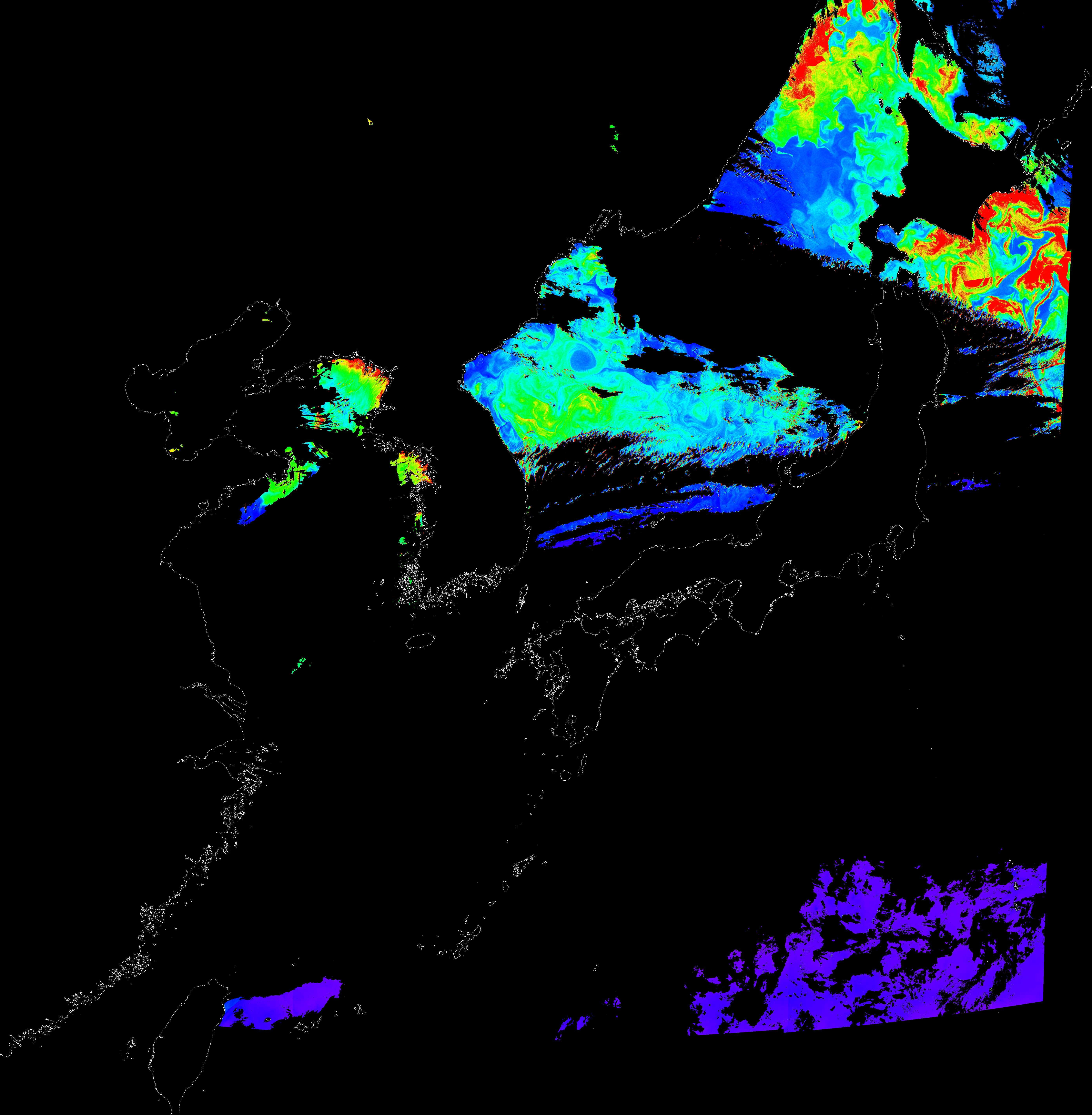 o 2017년 04월 10일 천리안 GOCI 클로로필 a 위성영상입니다.