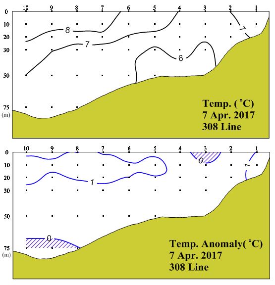 ◦ 201747일 국립수산과학원 서해수산연구소에서 조사한 308(대천 서방)수직수온분포도 및 평년편차도입니다.