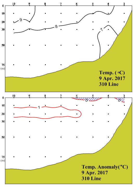 ◦ 2017년 4월 9일 국립수산과학원 서해수산연구소에서 조사한 310선(영광 서방)의 수직수온분포도 및 평년편차도입니다.