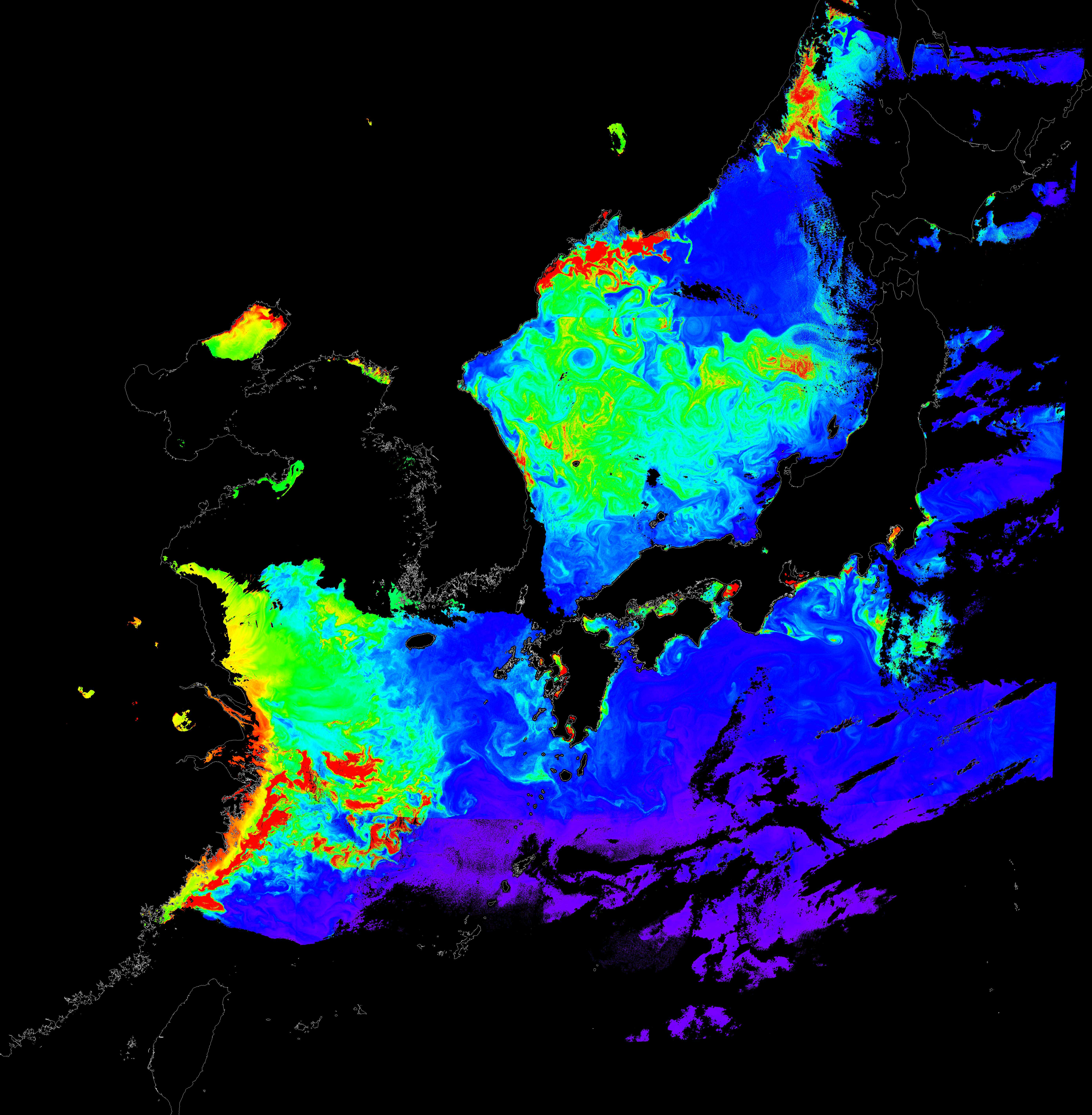 o 2017년 04월 13일 천리안 GOCI 클로로필 a 위성영상입니다.
