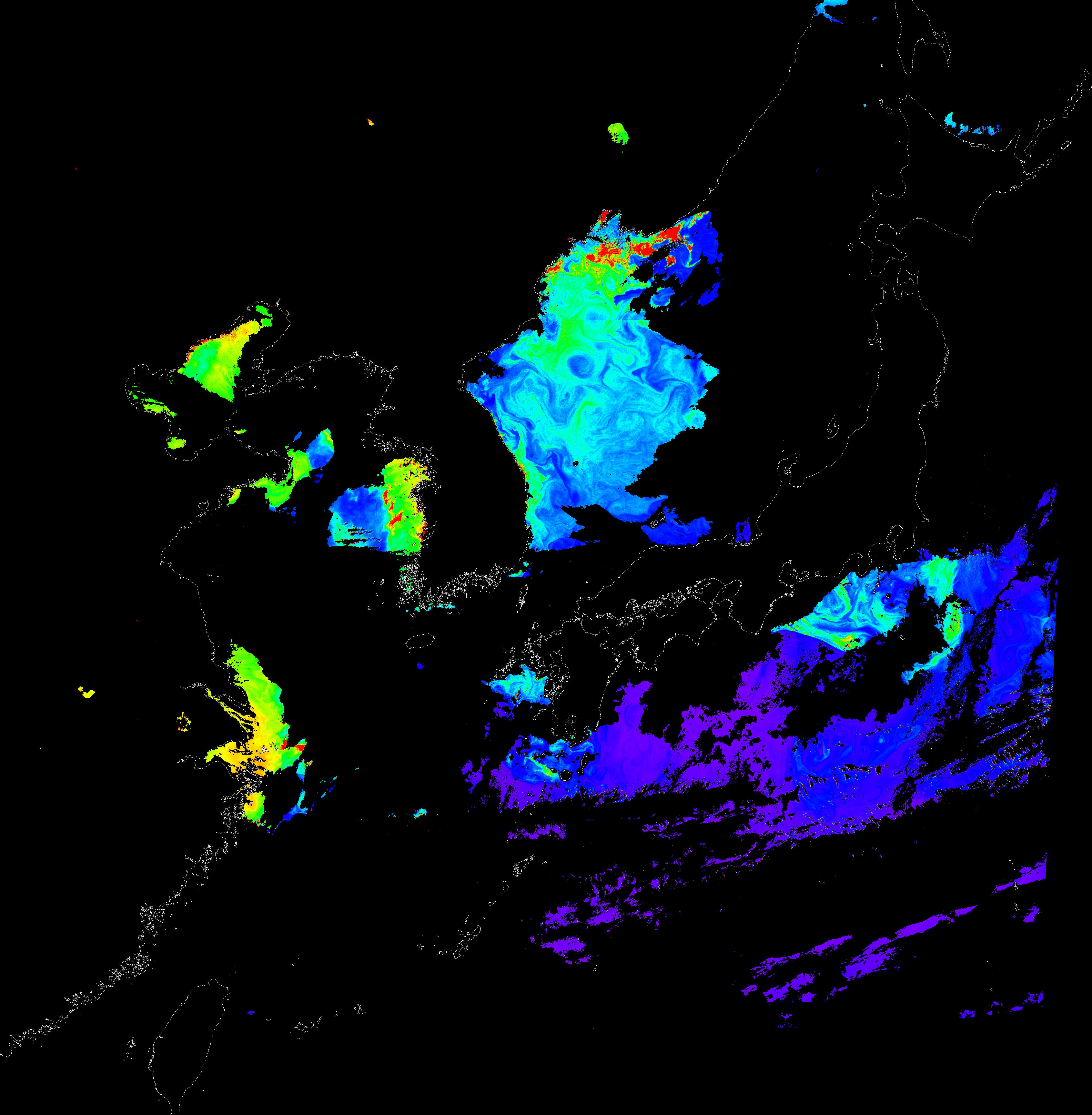 o 2017년 04월 15일 천리안 GOCI 클로로필 a 위성영상입니다.