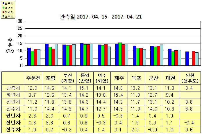 ◦ 금주(2017. 04. 15 ~ 2017. 04. 21)의 한반도 연안 표면수온은 동해 연안역에서 섭씨 12.0~14.5도, 남해 연안역 14.0~15.0도, 서해 연안역에서 9.5~13.0도로 나타납니다. ◦ 평년에 비해 동해 연안역은 0.5~2.5도 높게, 제주 0.8도 낮음을 제외한 남해 연안역은 0.5~1.0도 높게, 서해 연안역은 0.5~2.0도 높게 나타납니다. ◦ 전년에 기장 비슷함을 제외한 동해 연안역은 1.0~3.5도 높게, 여수 비슷함을 제외한 남해 연안역은 0.5~1.0도 높게, 군산 비슷함, 인천 0.4도 낮음을 제외한 서해 연안역은 1.0~1.5도 높게 나타납니다. |