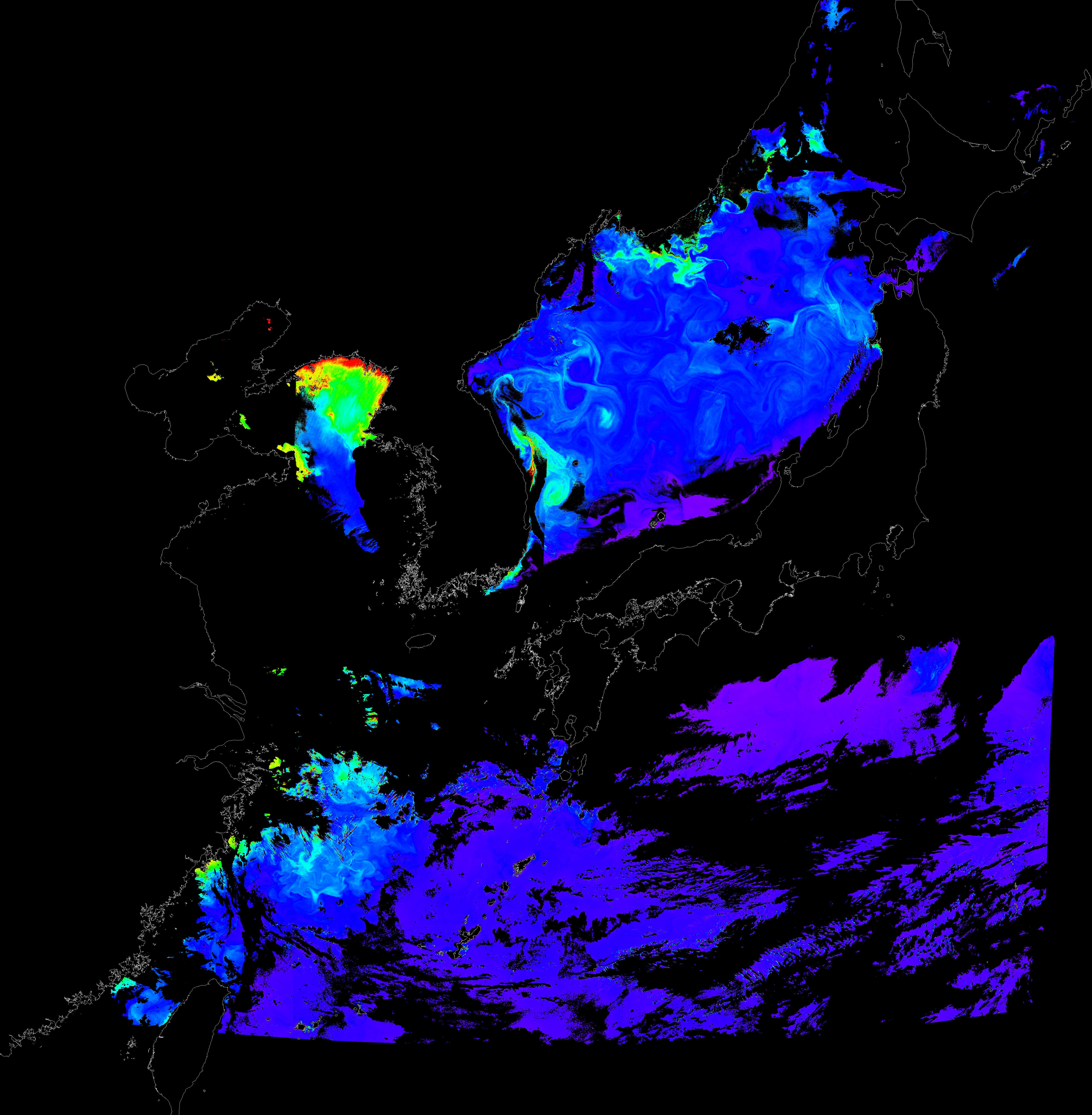 o 2017년 05월 01일 천리안 GOCI 클로로필 a 위성영상입니다.