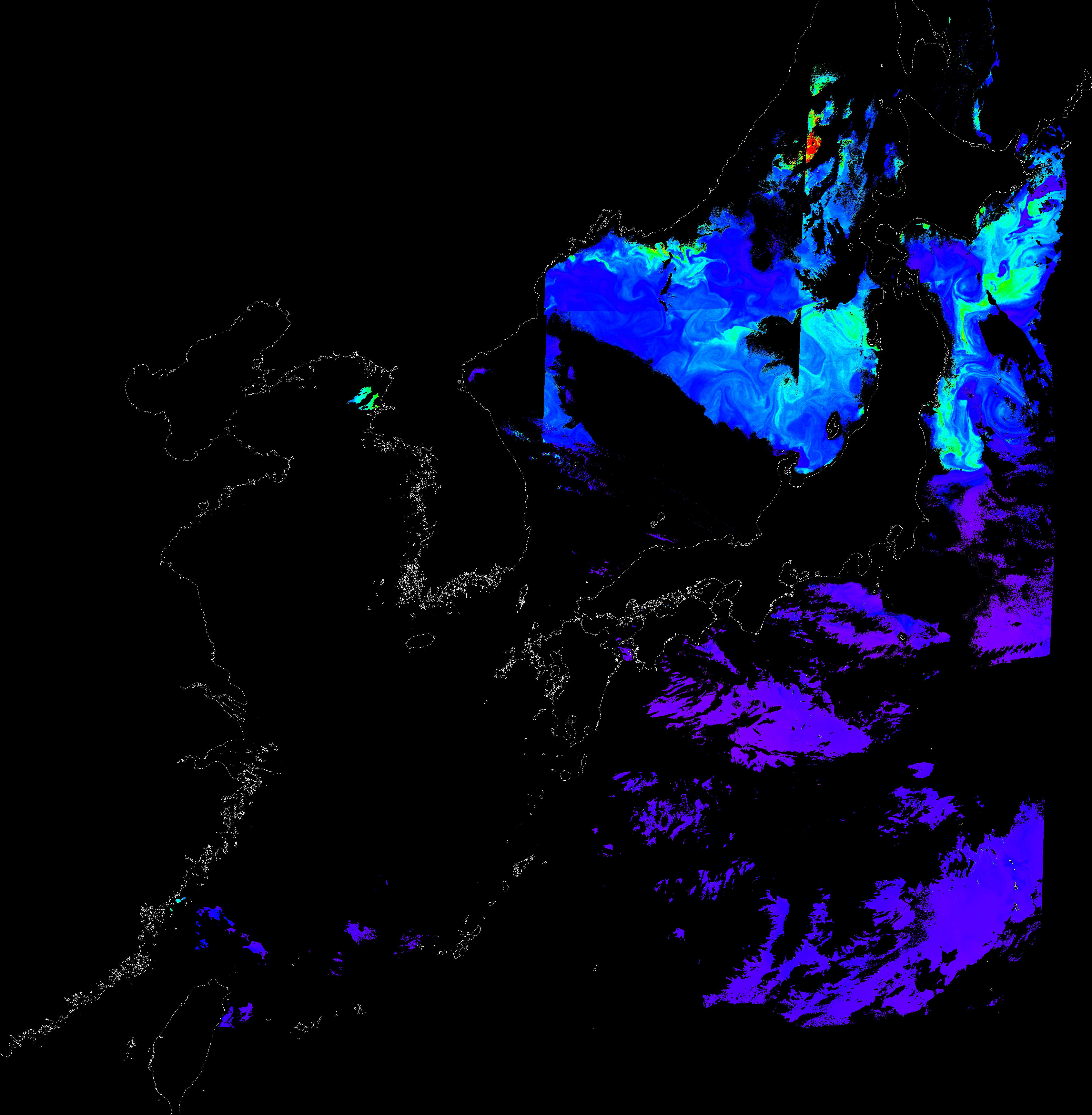 o 2017년 05월 02일 천리안 GOCI 클로로필 a 위성영상입니다.