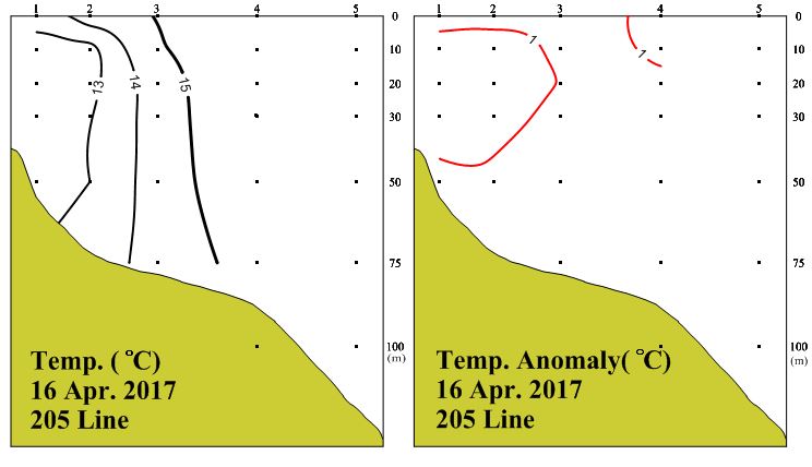 ◦ 2017년 4월 16일 국립수산과학원 남해수산연구소에서 조사한 205선(소리도 남동방)의 수직수온분포도 및 평년편차도입니다.