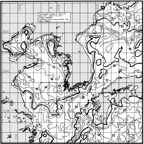 ◦ 금주(2017. 05. 09 ~ 2017. 05. 15)의 한국근해 표면수온은 대화퇴 근해 12~14도, 울릉도-독도 근해 15~16도, 대마도 근해 16~18도, 제주도 근해 15~17도, 이어도 근해 14~16도, 가거초 근해 13~14도, 어청도 근해 11~12도, 백령도 근해 10∼11도로 나타납니다. ◦ 「평년에 비해」대화퇴 근해 0.9도 높게, 울릉도-독도 근해 0.9도 높게, 대마도 근해 비슷하게, 제주도 근해 0.6도 낮게, 이어도 근해 0.6도 낮게, 가거초 근해 0.4도 낮게, 어청도 근해 0.5도 낮게 나타납니다. ◦ 「전년에 비해」대화퇴 근해 1도 높게, 울릉도-독도 근해 비슷하게, 대마도 근해 비슷하게, 제주도 근해 비슷하게, 이어도 근해 1.5도 높게, 가거초 1.5도 높게, 어청도 근해 1.5도 낮게, 백령도 근해 1.5도 높게 나타납니다. ◦ 수온 전선대는 우리나라 제주해협에서 대한해협까지 15도를 중심으로 형성됩니다. |