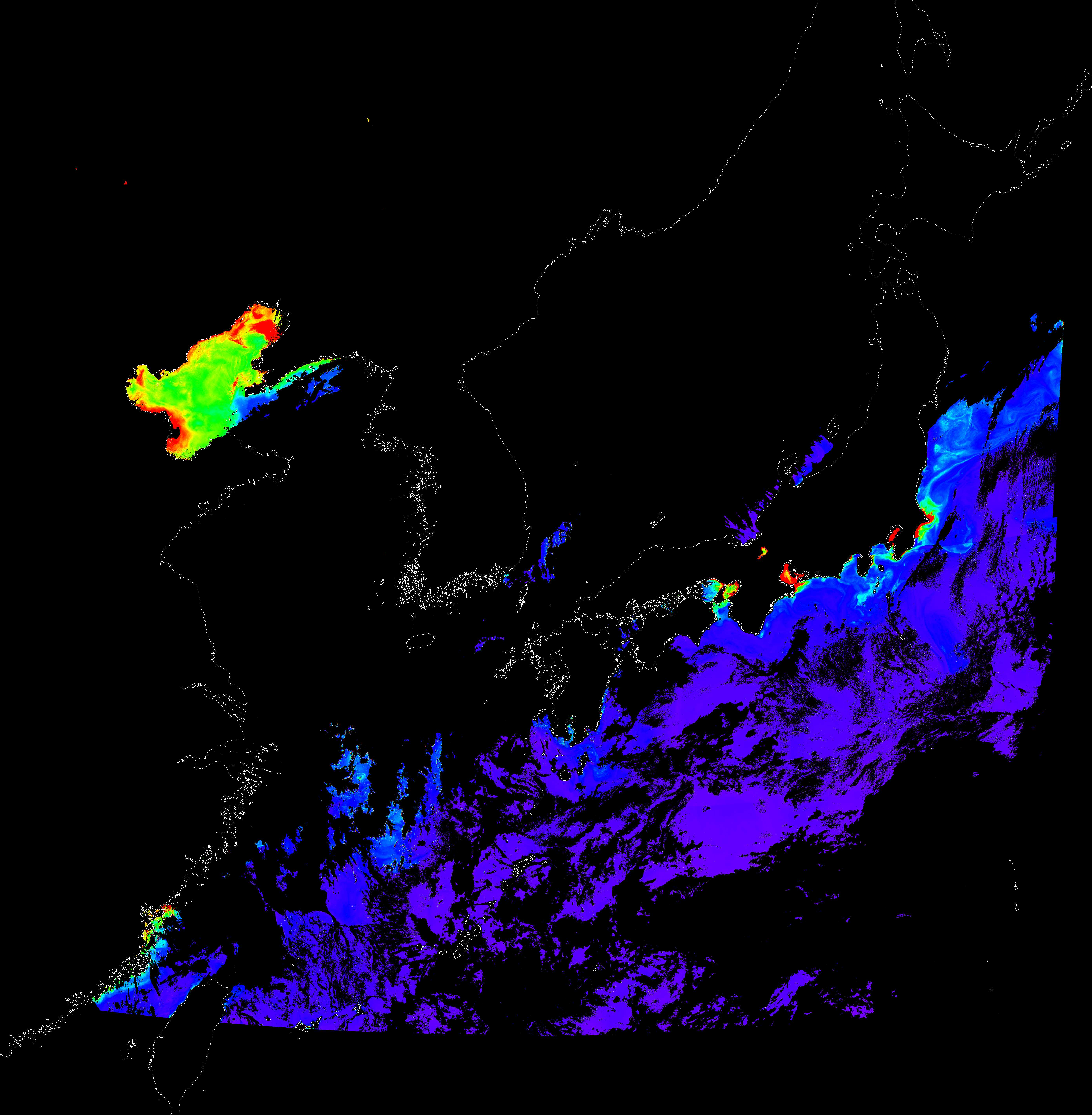 o 2017년 05월 22일 천리안 GOCI 클로로필 a 위성영상입니다. [ GOCI : Geostationary Ocean Color Imager ] o 농도분포는 하단 범례를 참고하시기 바랍니다. o 검은색은 구름을 나타냅니다. o 그림을 클릭하시면 크게 보실 수 있습니다.
