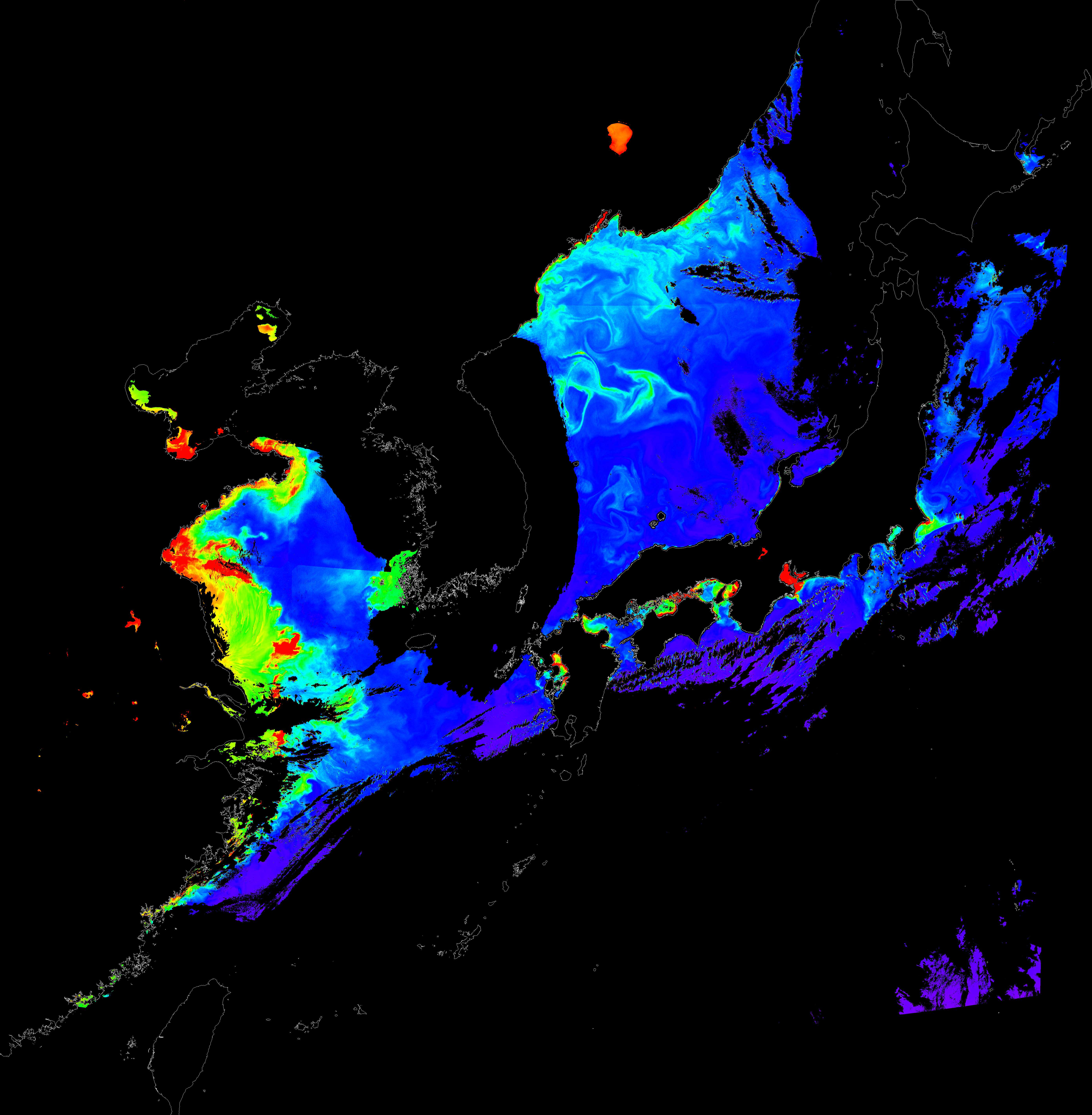 o 2017년 05월 28일 천리안 GOCI 클로로필 a 위성영상입니다. [ GOCI : Geostationary Ocean Color Imager ] o 농도분포는 하단 범례를 참고하시기 바랍니다. o 검은색은 구름을 나타냅니다. o 그림을 클릭하시면 크게 보실 수 있습니다.