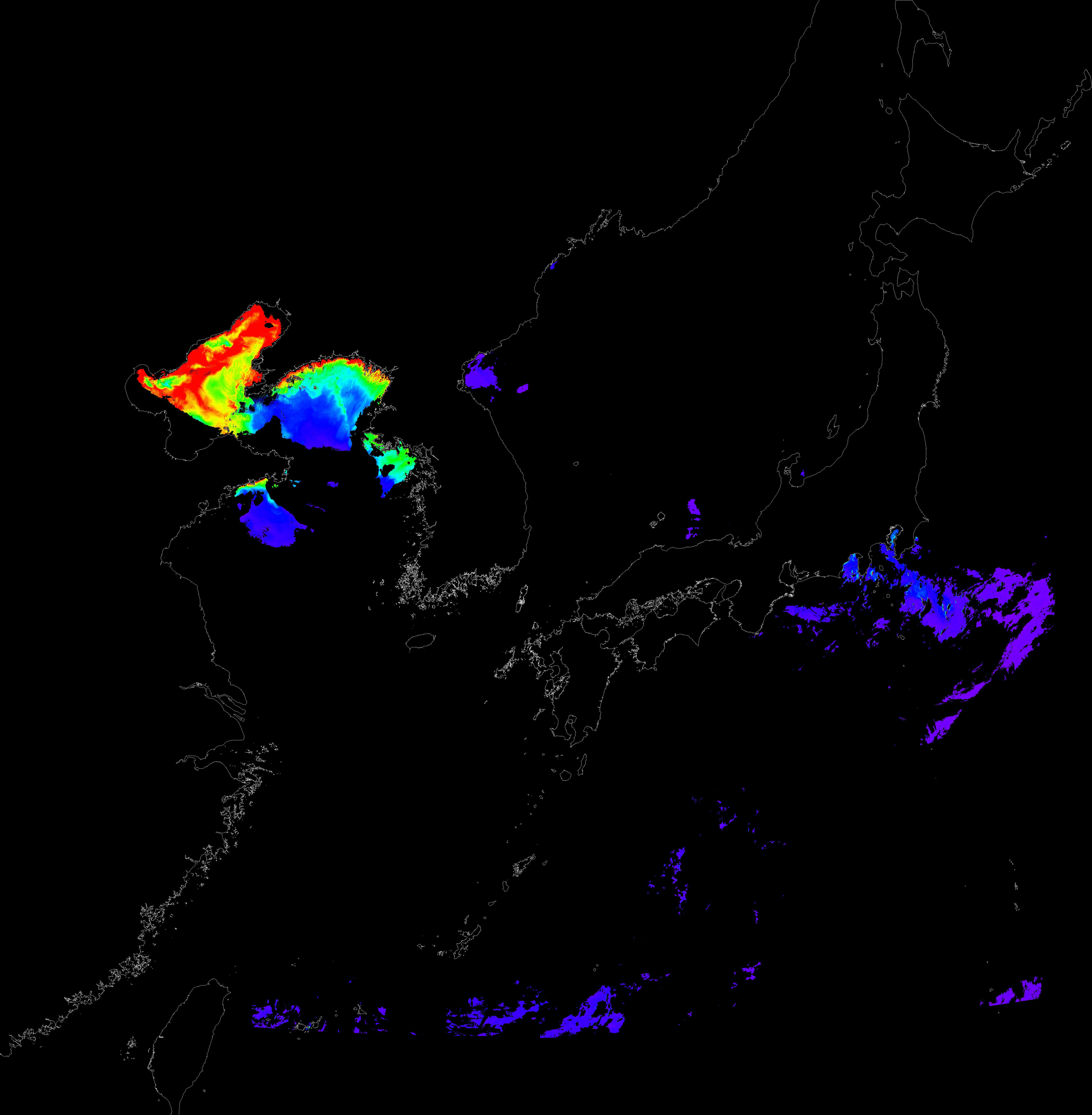 o 2017년 06월 01일 천리안 GOCI 클로로필 a 위성영상입니다. [ GOCI : Geostationary Ocean Color Imager ] o 농도분포는 하단 범례를 참고하시기 바랍니다. o 검은색은 구름을 나타냅니다.