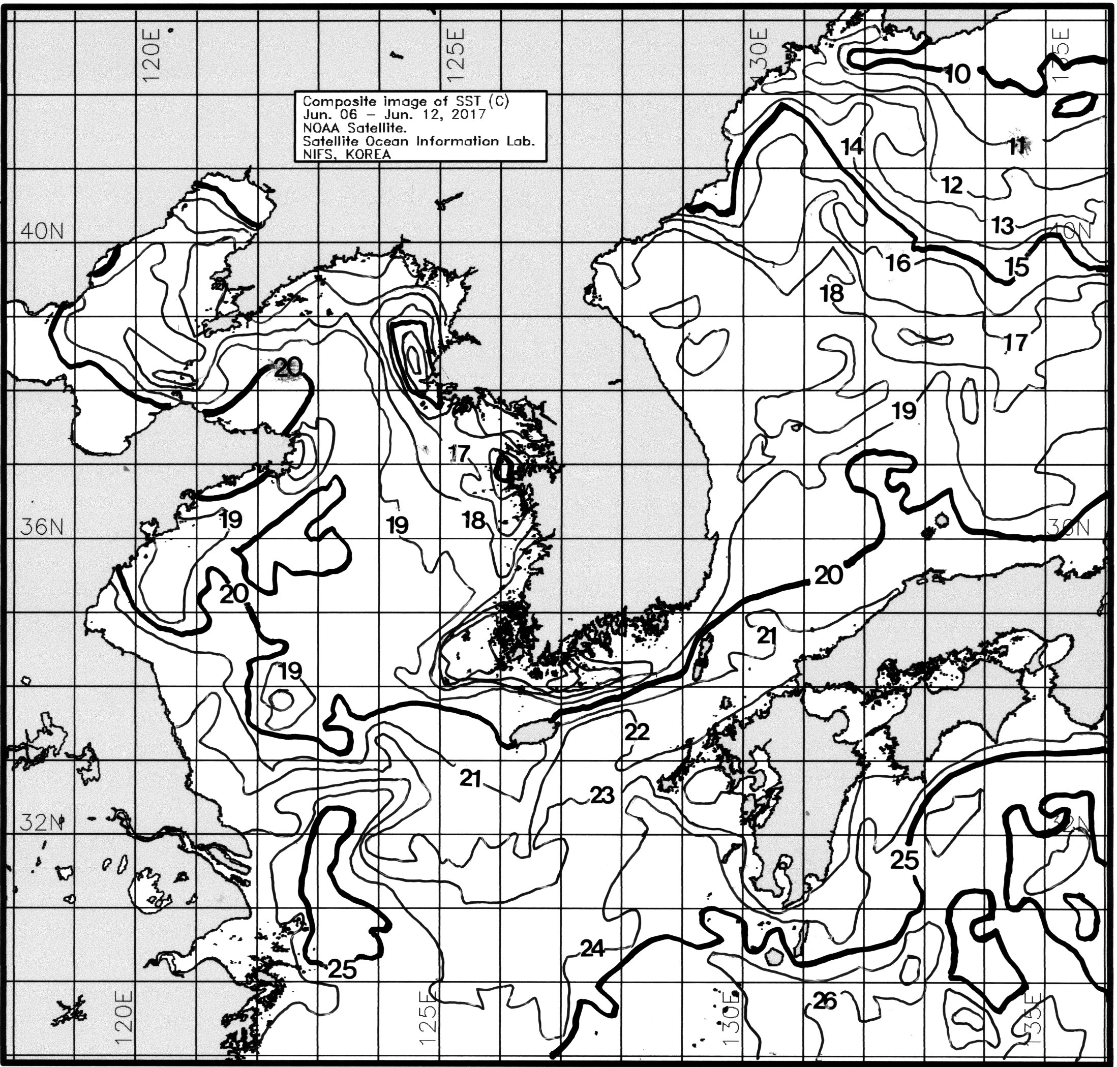 ○ 금주(2017. 06. 06 ~ 2017. 06. 12)의 한국근해 표면수온은 대화퇴 근해 16~18도, 울릉도-독도 근해 18~19도, 대마도 근해 20~21도, 제주도 근해 19~21도, 이어도 근해 21~22도, 가거초 근해 18~20도, 어청도 근해 17~18도, 백령도 근해 14∼15도로 나타납니다. ○ 「평년에 비해」대화퇴 근해 0.5도 낮게, 울릉도-독도 근해 비슷하게, 대마도 근해 0.5도 높게, 제주도 근해 0.5도 높게, 이어도 근해 2도 높게, 가거초 근해 1도 높게, 어청도 근해 비슷하게 나타납니다. ○ 「전년에 비해」대화퇴 근해 1.5도 낮게, 울릉도-독도 근해 2도 낮게, 대마도 근해 0.5도 낮게, 제주도 근해 0.5도 높게, 이어도 근해 1도 높게, 가거초 근해 0.5도 높게, 어청도 근해 1.5도 낮게, 백령도 근해 0.5도 낮게 나타납니다. ○ 수온 전선대는 우리나라 제주해협에서 대한해협까지 19도를 중심으로 형성됩니다.