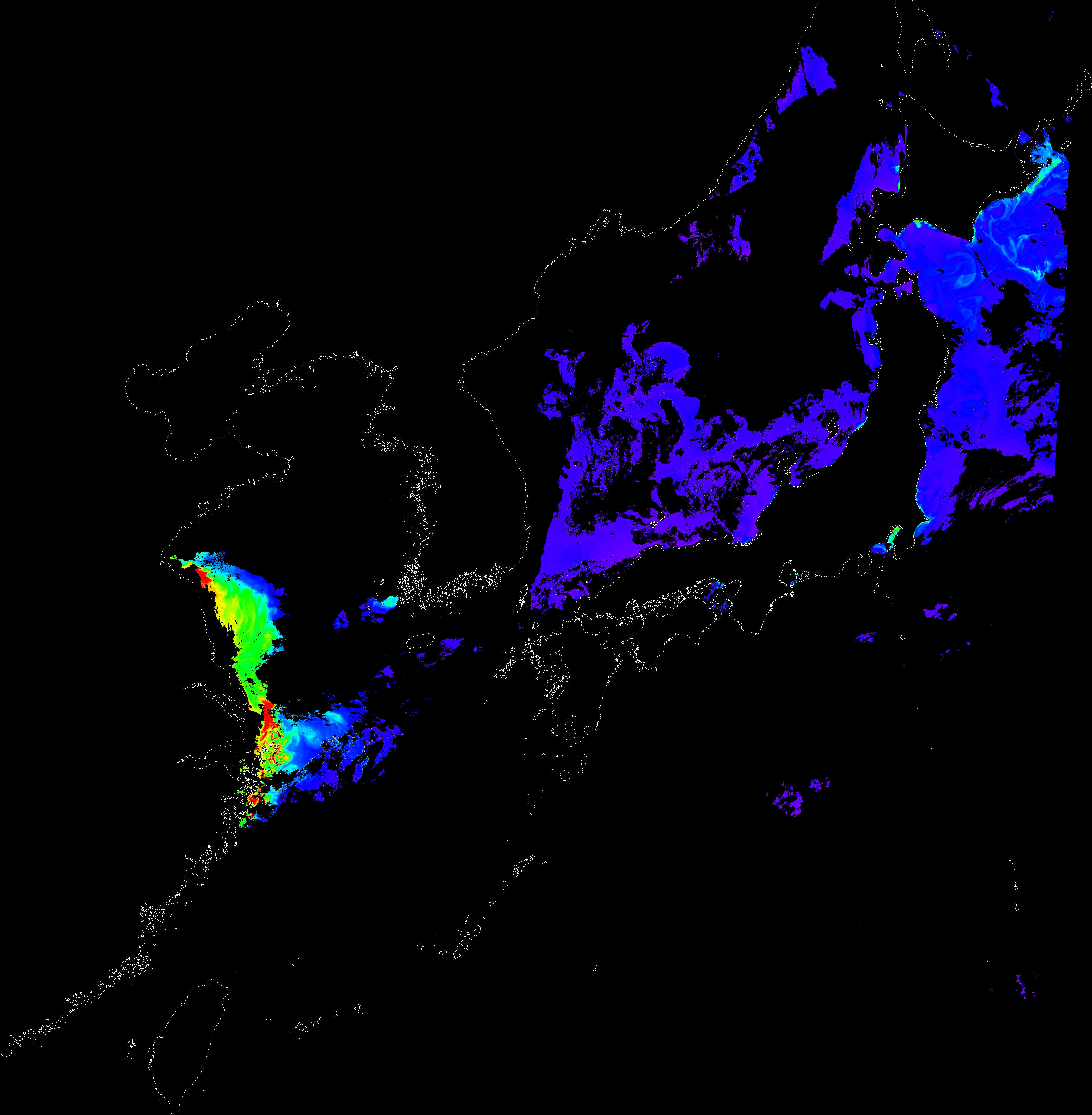 o 2017년 06월 17일 천리안 GOCI 클로로필 a 위성영상입니다. [ GOCI : Geostationary Ocean Color Imager ] o 농도분포는 하단 범례를 참고하시기 바랍니다. o 검은색은 구름을 나타냅니다.