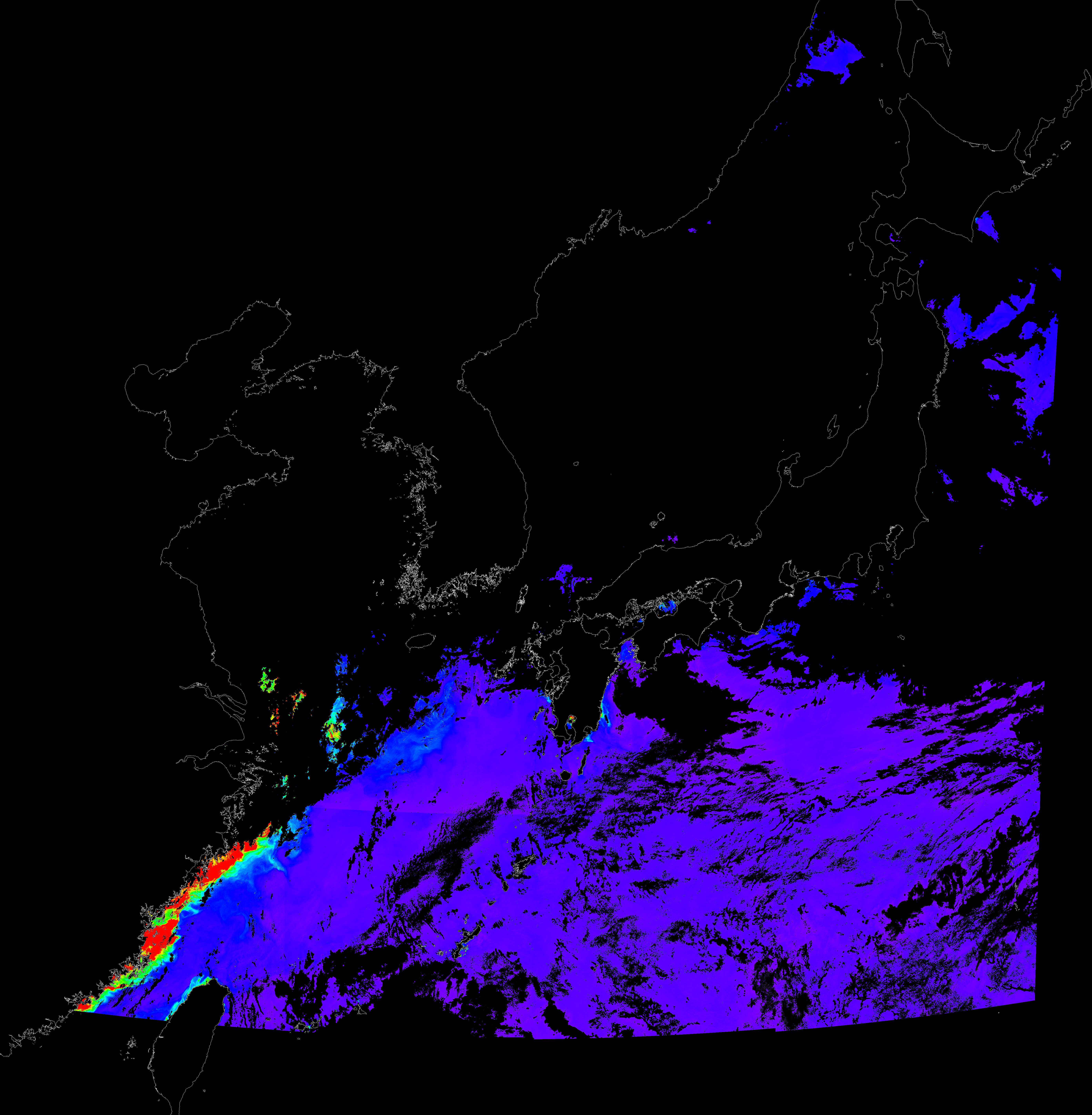 o 2017년 07월 02일 천리안 GOCI 클로로필 a 위성영상입니다. [ GOCI : Geostationary Ocean Color Imager ] o 농도분포는 하단 범례를 참고하시기 바랍니다. o 검은색은 구름을 나타냅니다.