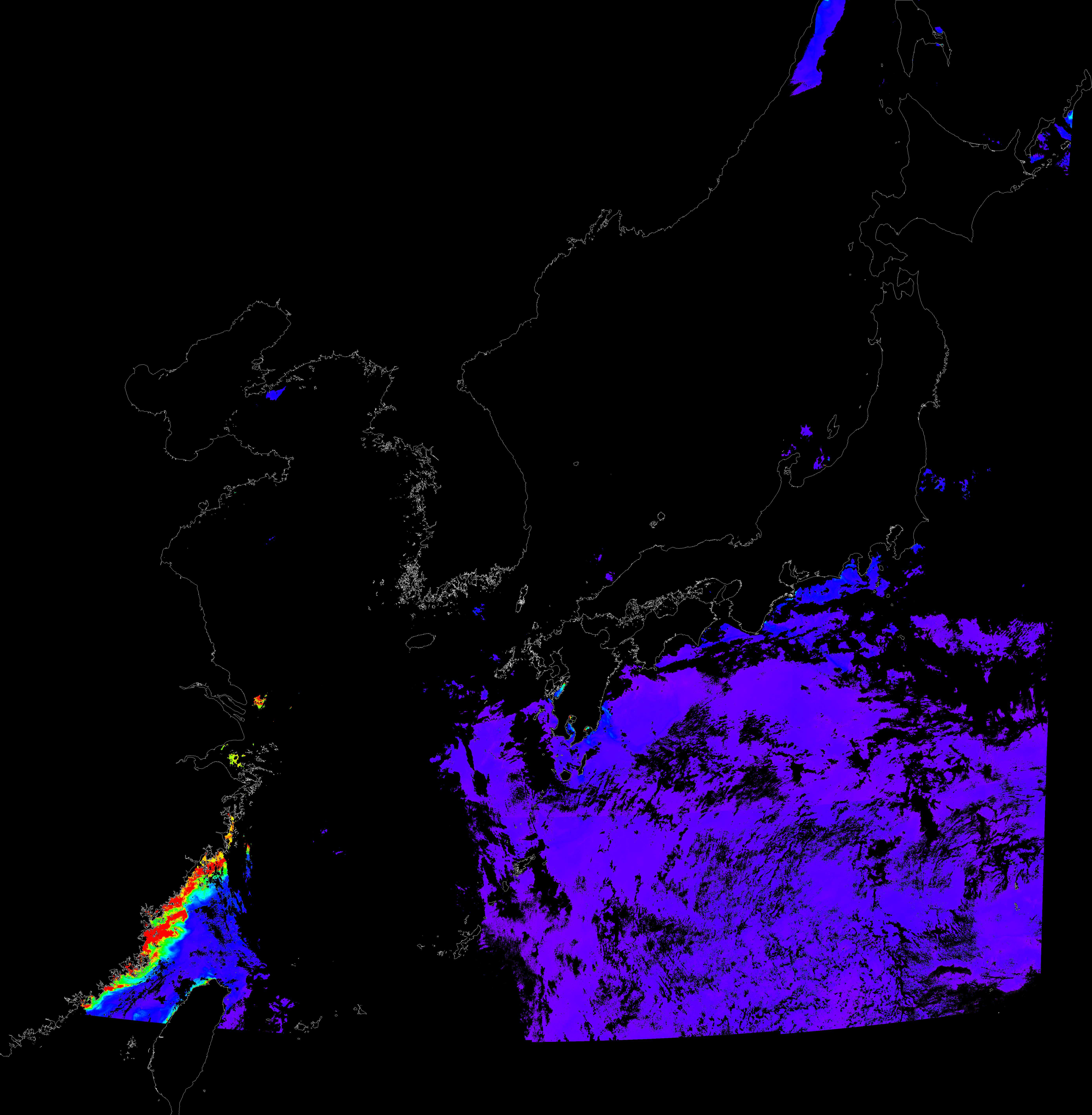 o 2017년 07월 03일 천리안 GOCI 클로로필 a 위성영상입니다. [ GOCI : Geostationary Ocean Color Imager ] o 농도분포는 하단 범례를 참고하시기 바랍니다. o 검은색은 구름을 나타냅니다.