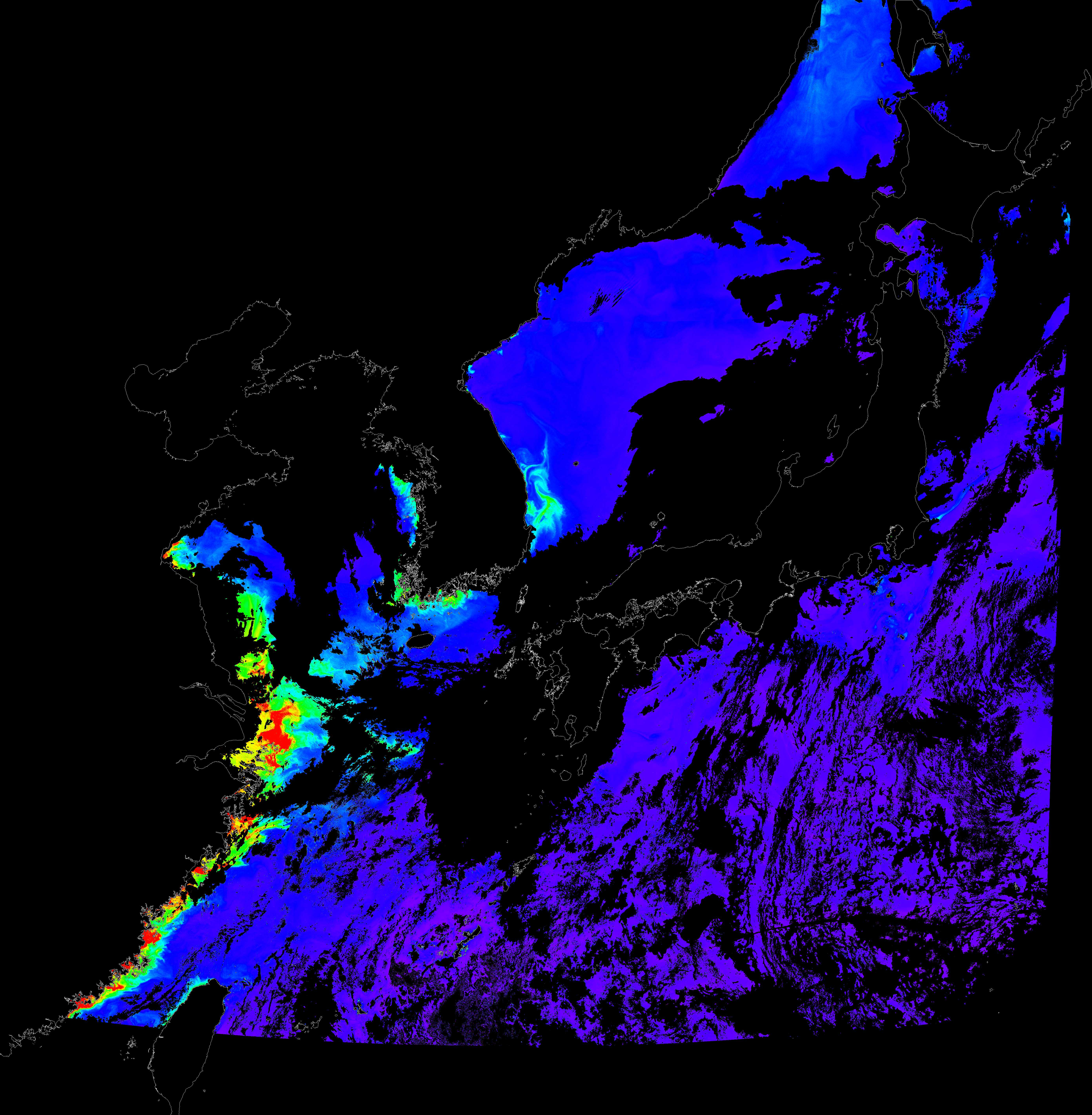o 2017년 07월 12일 천리안 GOCI 클로로필 a 위성영상입니다. [ GOCI : Geostationary Ocean Color Imager ] o 농도분포는 하단 범례를 참고하시기 바랍니다. o 검은색은 구름을 나타냅니다.