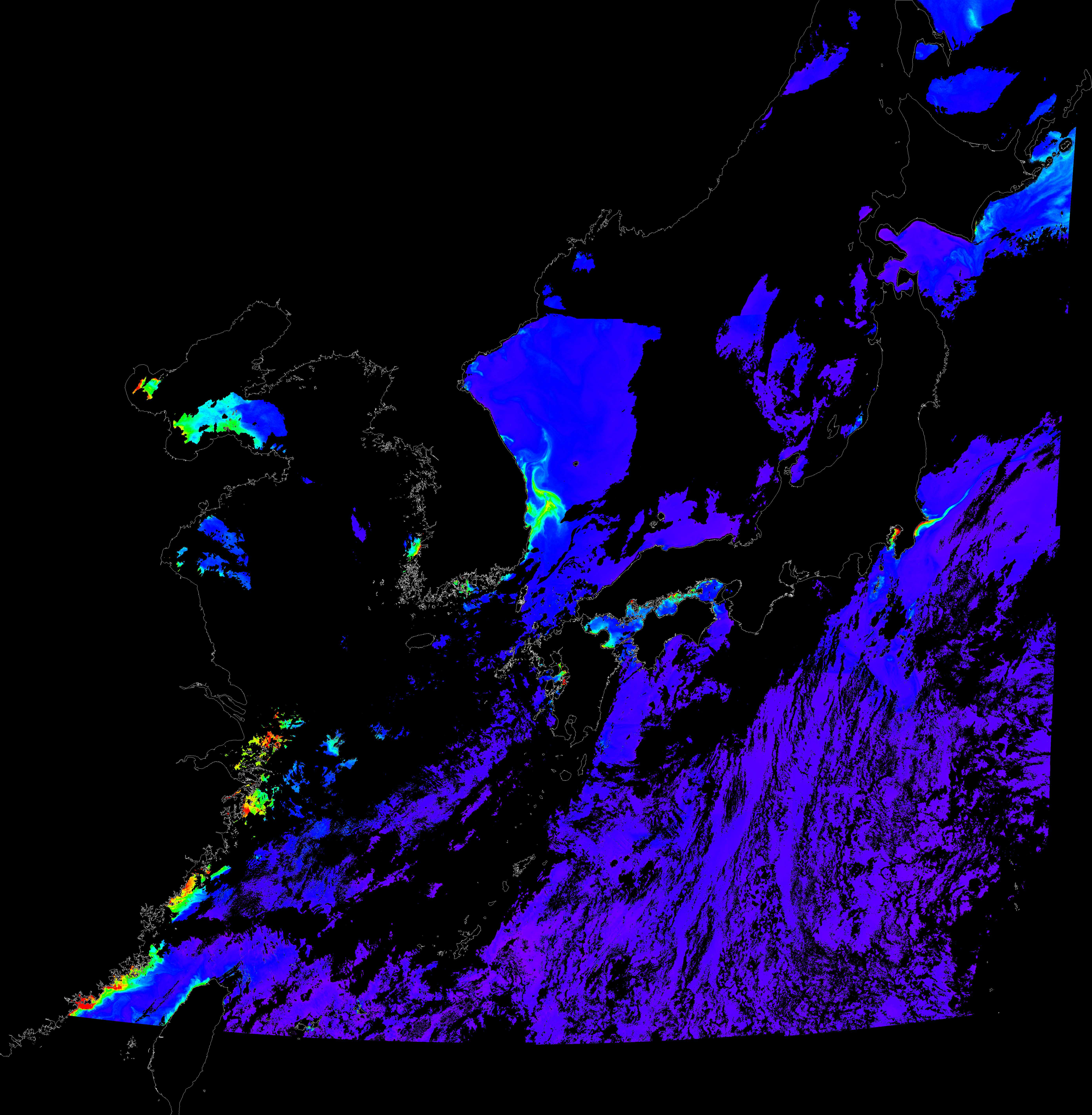 o 2017년 07월 13일 천리안 GOCI 클로로필 a 위성영상입니다. [ GOCI : Geostationary Ocean Color Imager ] o 농도분포는 하단 범례를 참고하시기 바랍니다. o 검은색은 구름을 나타냅니다.