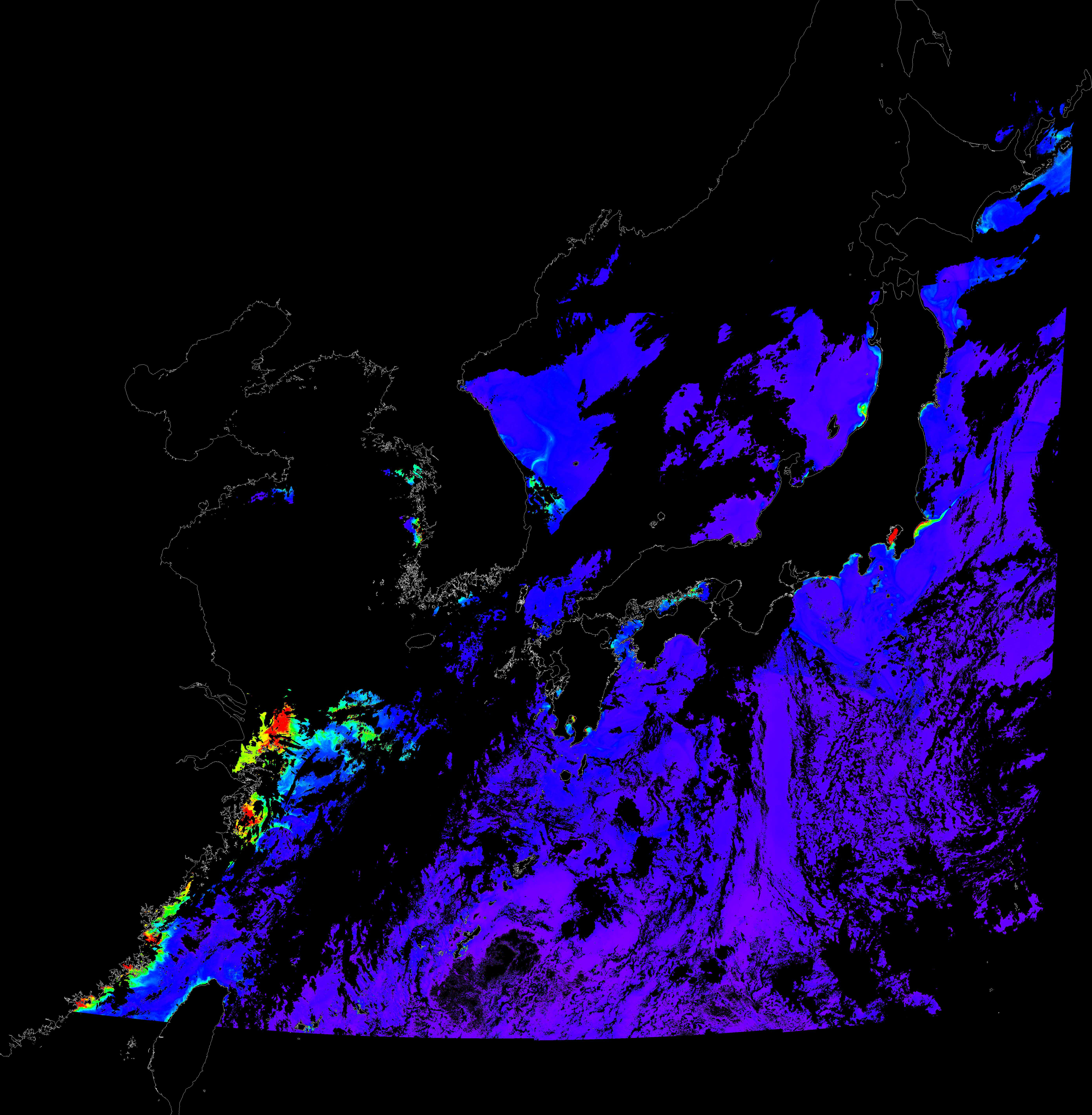 o 2017년 07월 14일 천리안 GOCI 클로로필 a 위성영상입니다. [ GOCI : Geostationary Ocean Color Imager ] o 농도분포는 하단 범례를 참고하시기 바랍니다. o 검은색은 구름을 나타냅니다.