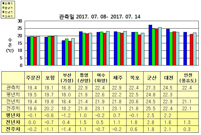 ○ 금주(2017. 07. 08 ~ 2017. 07. 14)의 한반도 연안 표면수온은 동해 연안역에서 섭씨 16.5~19.5도, 남해 연안역 22.5~23.0도, 서해 연안역에서 22.5~27.5도로 나타납니다. ○ 평년에 비해 주문진 비슷함을 제외한 동해 연안역은 0.5~1.5도 낮게, 여수(화양) 비슷함을 제외한 남해 연안역은 0.5~1.0도 높게, 목포 비슷함을 제외한 서해 연안역은 2.0~2.5도 높게 나타납니다. ○ 전년에 비해 주문진 비슷함, 포항 0.7도 낮음을 제외한 동해 연안역은 0.5~1.0도 높게, 남해 연안역은 0.5~1.0도 높게, 서해 연안역은 1.5~3.0도 높게 나타납니다.