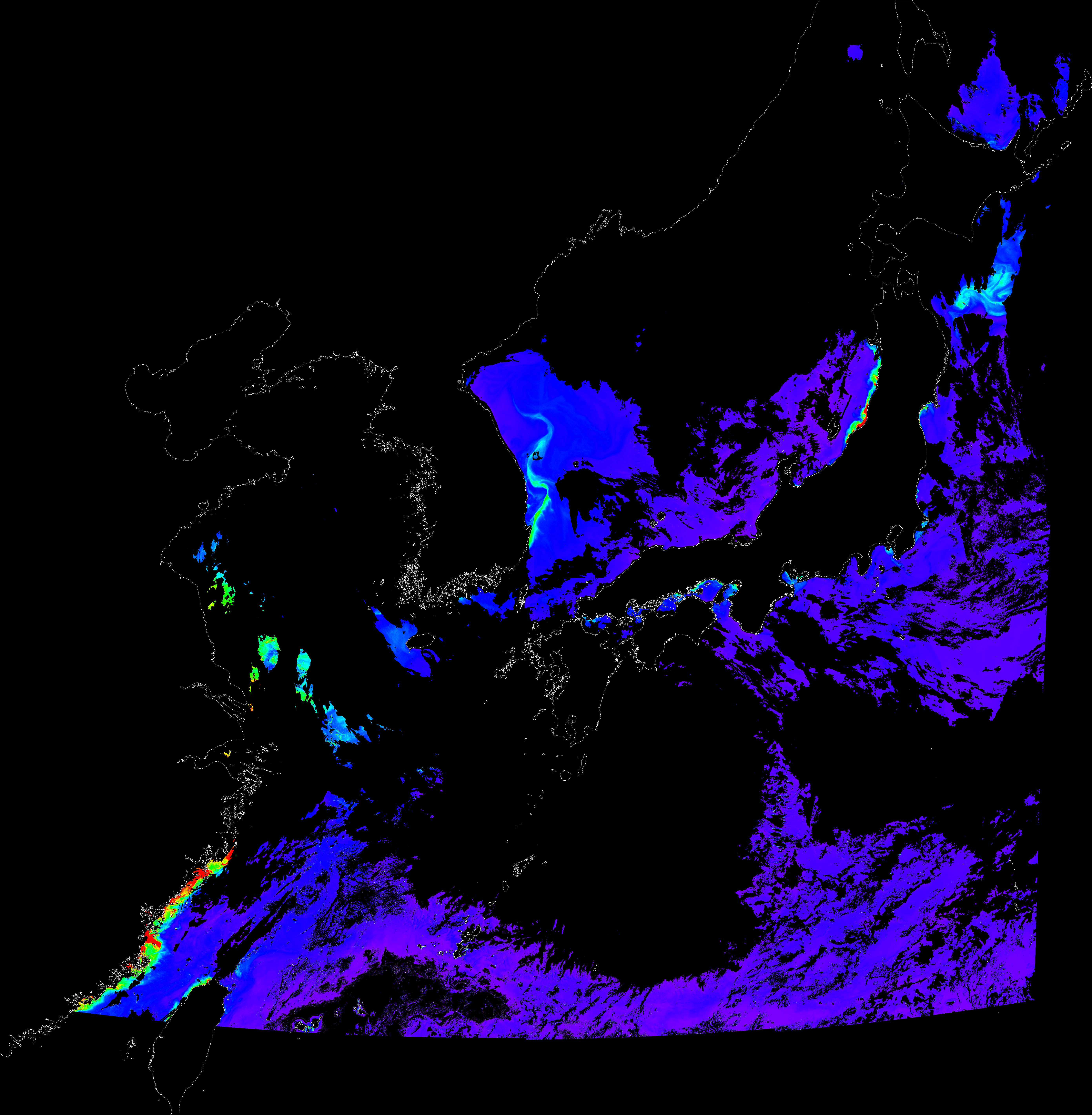 o 2017년 07월 19일 천리안 GOCI 클로로필 a 위성영상입니다. [ GOCI : Geostationary Ocean Color Imager ] o 농도분포는 하단 범례를 참고하시기 바랍니다. o 검은색은 구름을 나타냅니다.