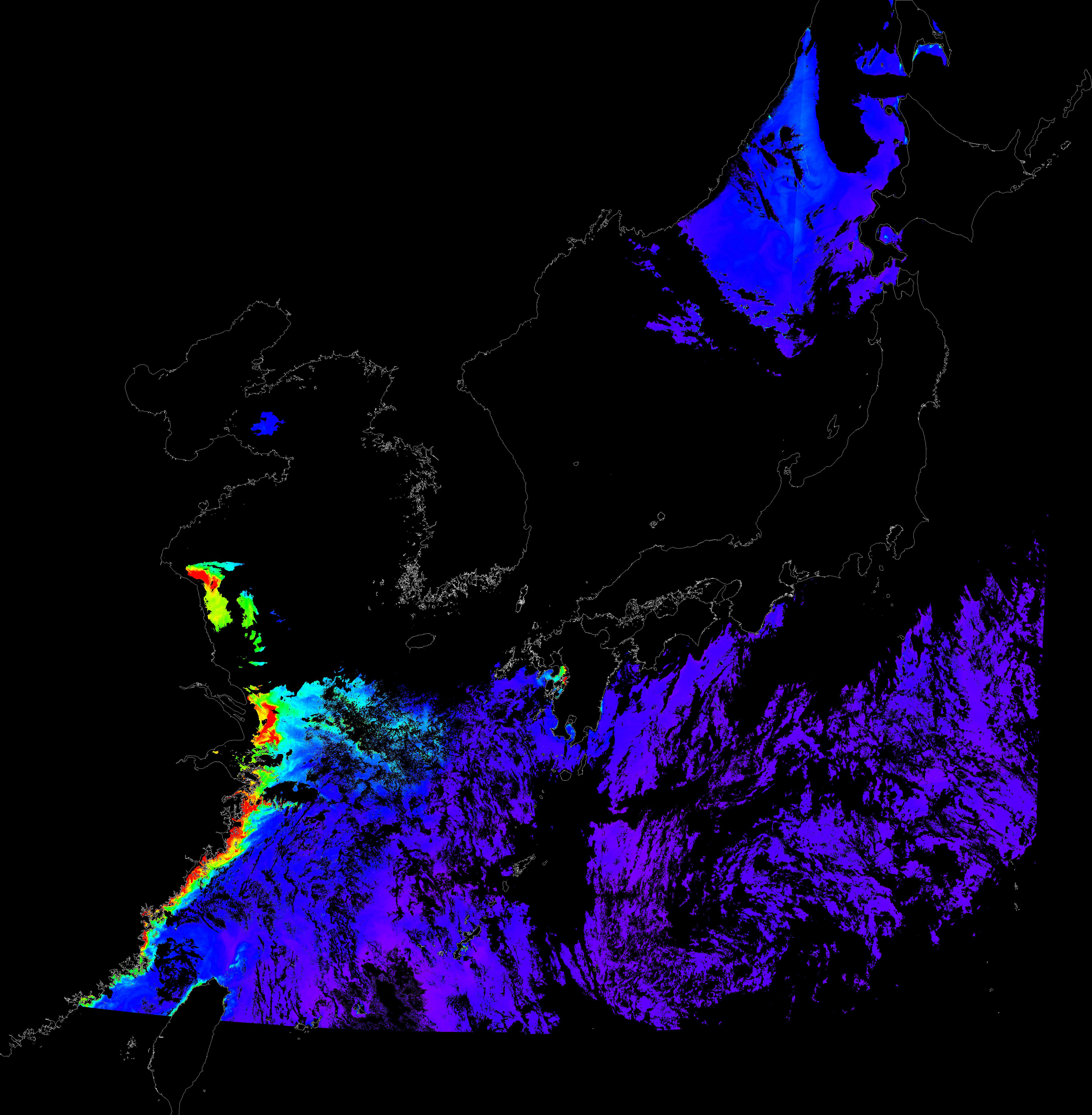 o 2017년 07월 23일 천리안 GOCI 클로로필 a 위성영상입니다. [ GOCI : Geostationary Ocean Color Imager ] o 농도분포는 하단 범례를 참고하시기 바랍니다. o 검은색은 구름을 나타냅니다.