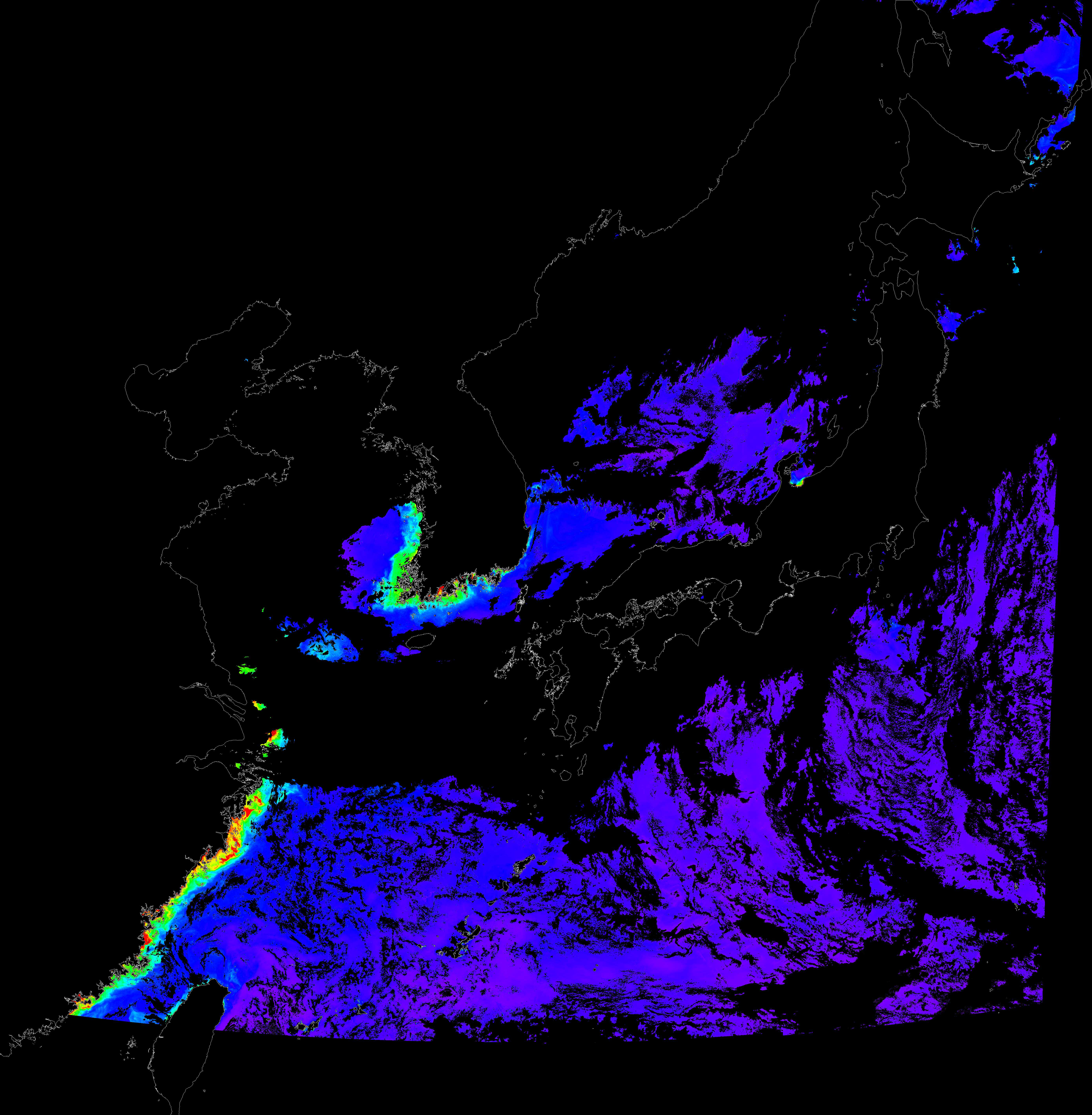 o 2017년 07월 27일 천리안 GOCI 클로로필 a 위성영상입니다. [ GOCI : Geostationary Ocean Color Imager ] o 농도분포는 하단 범례를 참고하시기 바랍니다. o 검은색은 구름을 나타냅니다.