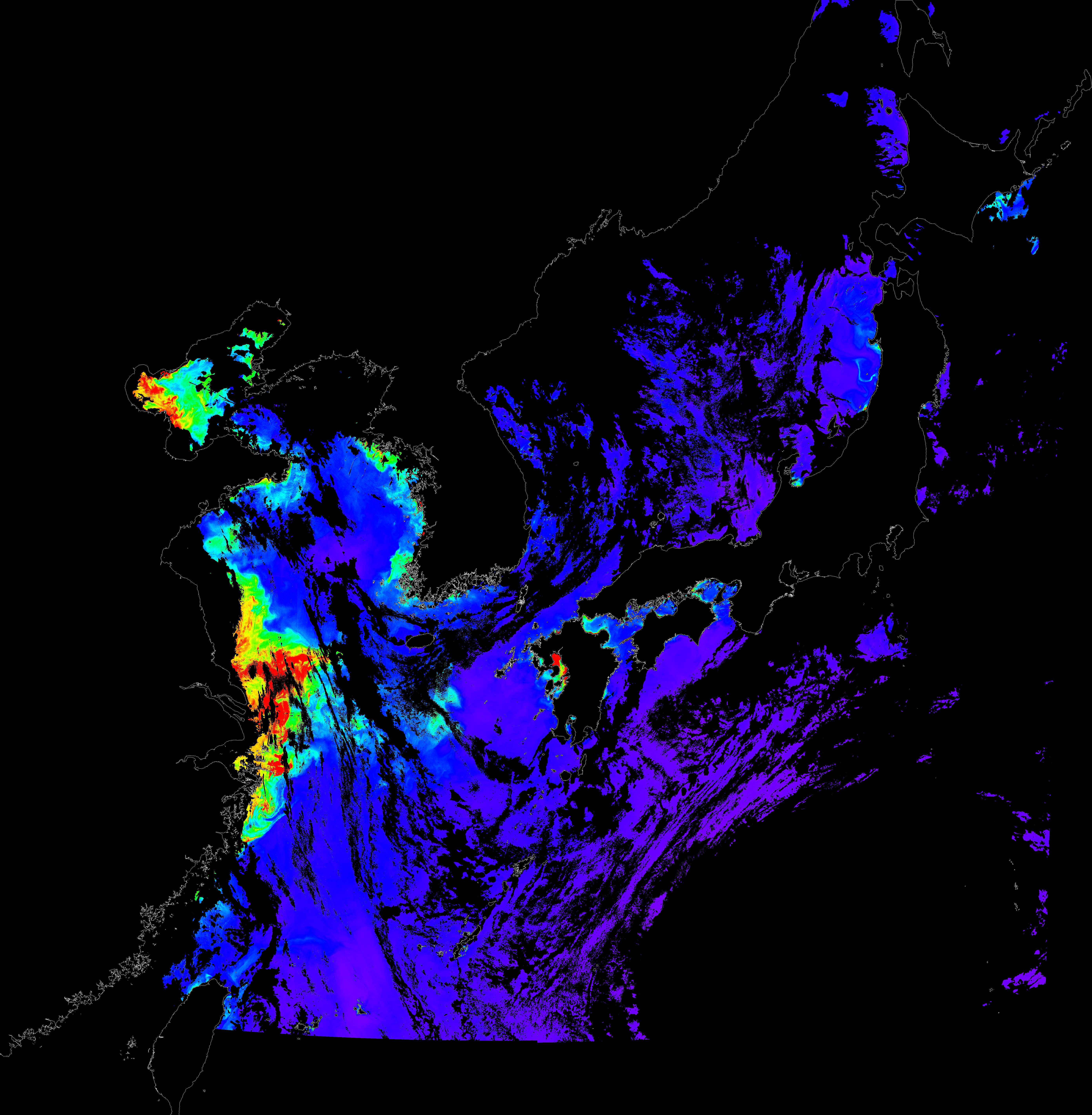 o 2017년 08월 02일 천리안 GOCI 클로로필 a 위성영상입니다. [ GOCI : Geostationary Ocean Color Imager ] o 농도분포는 하단 범례를 참고하시기 바랍니다. o 검은색은 구름을 나타냅니다.