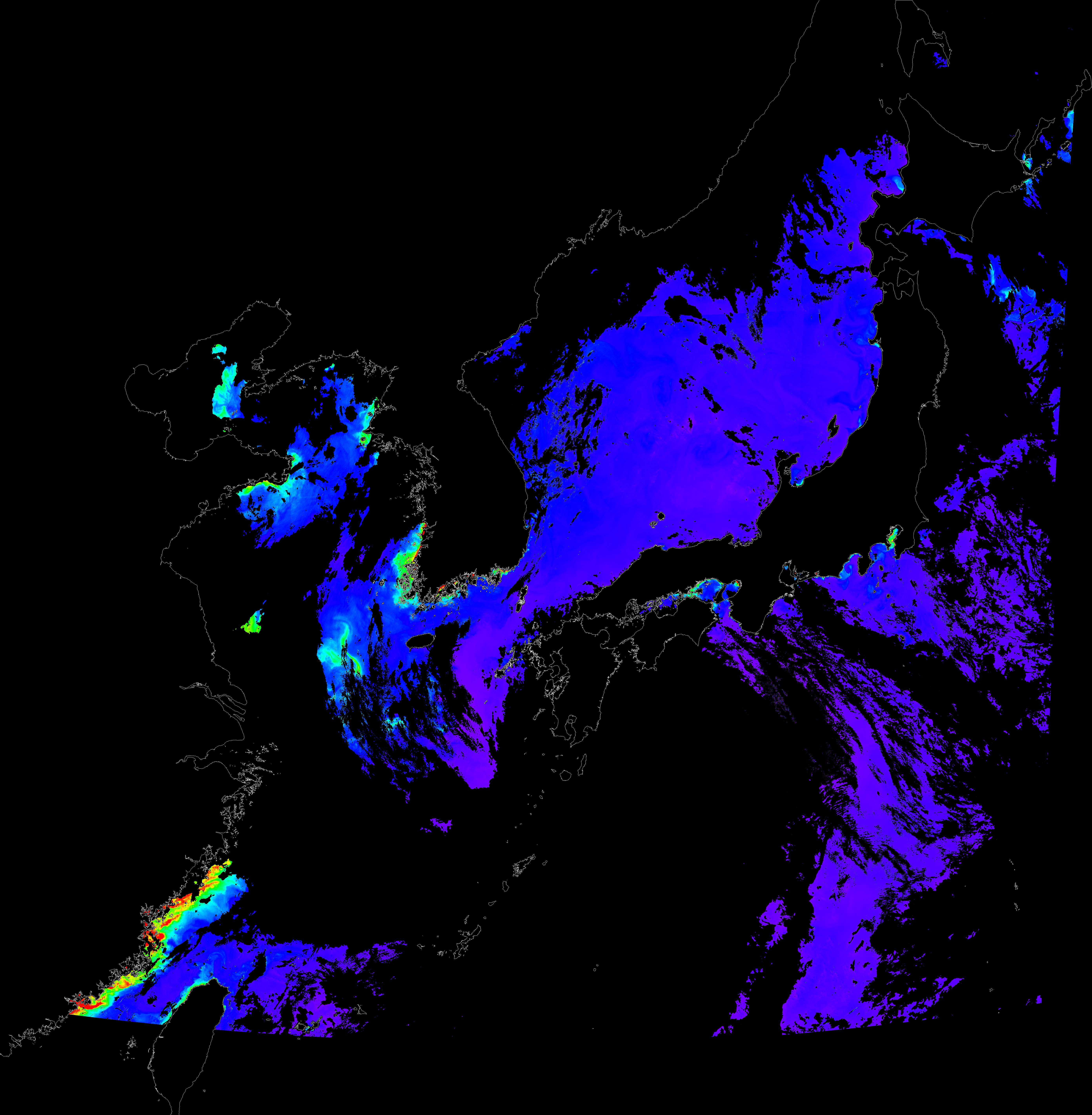 o 2017년 08월 06일 천리안 GOCI 클로로필 a 위성영상입니다. [ GOCI : Geostationary Ocean Color Imager ] o 농도분포는 하단 범례를 참고하시기 바랍니다. o 검은색은 구름을 나타냅니다.
