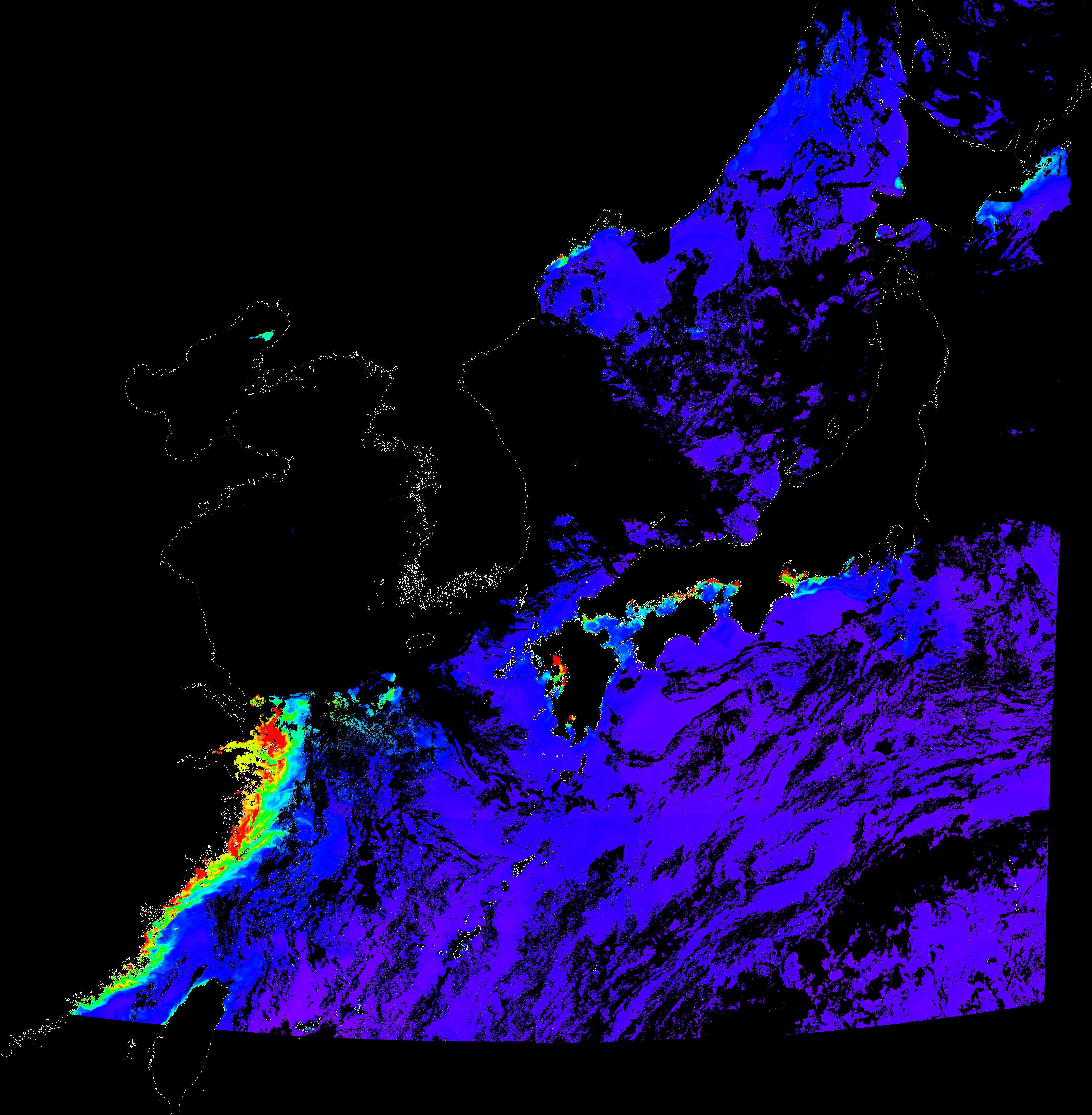 o 2017년 08월 19일 천리안 GOCI 클로로필 a 위성영상입니다. [ GOCI : Geostationary Ocean Color Imager ] o 농도분포는 하단 범례를 참고하시기 바랍니다. o 검은색은 구름을 나타냅니다.