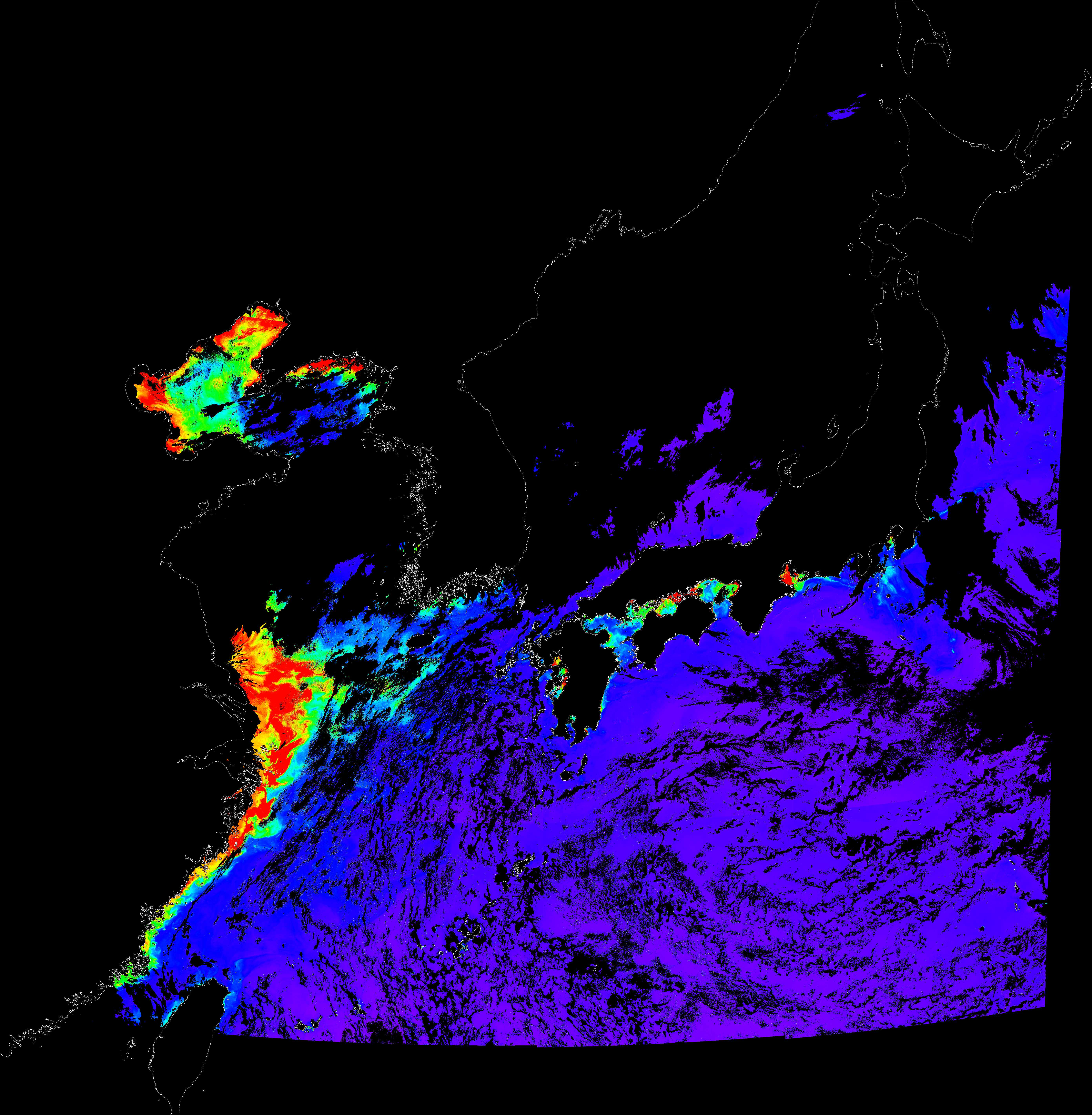 o 2017년 08월 24일 천리안 GOCI 클로로필 a 위성영상입니다. [ GOCI : Geostationary Ocean Color Imager ] o 농도분포는 하단 범례를 참고하시기 바랍니다. o 검은색은 구름을 나타냅니다.