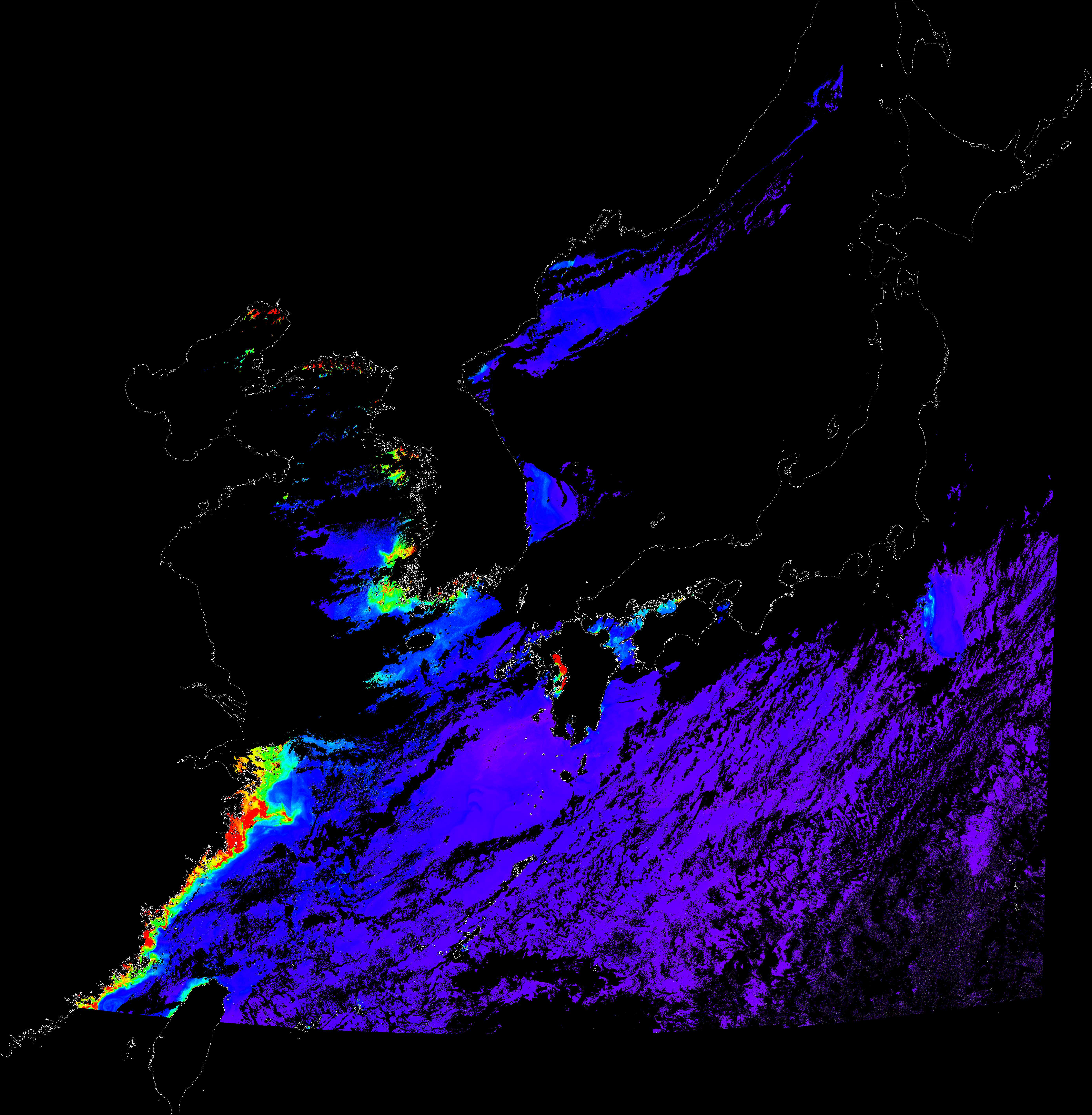 o 2017년 08월 29일 천리안 GOCI 클로로필 a 위성영상입니다. [ GOCI : Geostationary Ocean Color Imager ] o 농도분포는 하단 범례를 참고하시기 바랍니다. o 검은색은 구름을 나타냅니다.