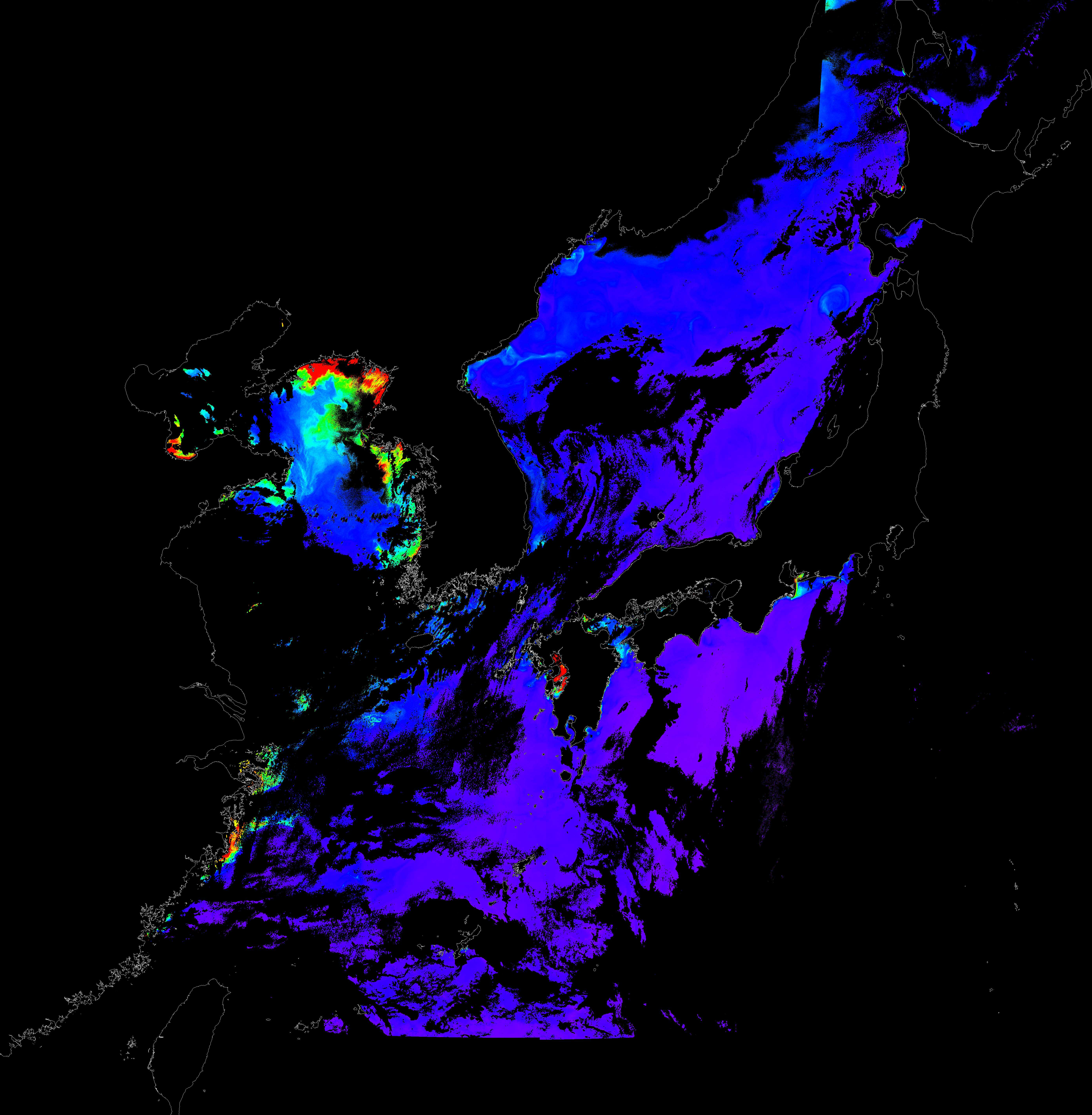 o 2017년 08월 31일 천리안 GOCI 클로로필 a 위성영상입니다. [ GOCI : Geostationary Ocean Color Imager ] o 농도분포는 하단 범례를 참고하시기 바랍니다. o 검은색은 구름을 나타냅니다.