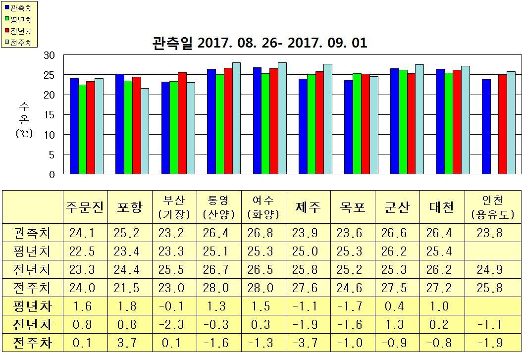 ○ 금주(2017. 08. 26 ~ 2017. 09. 01)의 한반도 연안 표면수온은 동해 연안역에서 섭씨 23~25도, 남해 연안역 23.5~27.0도, 서해 연안역에서 23.5~26.5도로 나타납니다. ○ 평년에 비해 기장 비슷함을 제외한 동해 연안역은 1.5~2.0도 높게, 제주 1.0~1.5도 낮음을 제외한 남해 연안역은 1.0~1.5도 높게, 목포 1.5~2.0도 낮음을 제외한 서해 연안역은 0.5~1.0도 높게 나타납니다. ○ 전년에 비해 기장 2.0~2.5도 낮음을 제외한 동해 연안역은 0.5~1.0도 높게, 제주 1.5~2.0도 낮음을 제외한 남해 연안역은 비슷하게, 군산 1.0~1.5도 높음, 대천 비슷함을 제외한 서해 연안역은 1.0~1.5도 낮게 나타납니다.