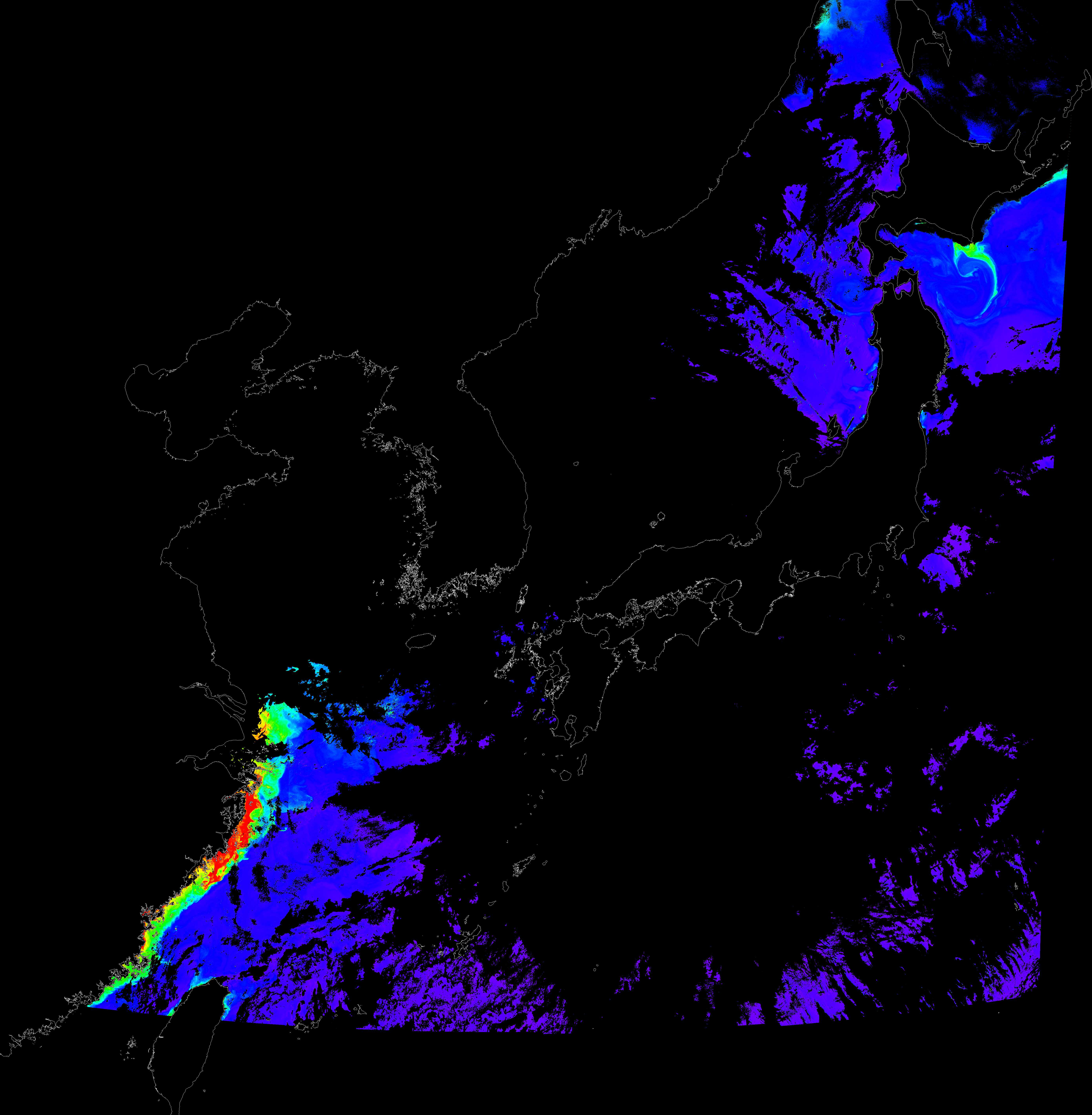 o 2017년 09월 05일 천리안 GOCI 클로로필 a 위성영상입니다. [ GOCI : Geostationary Ocean Color Imager ] o 농도분포는 하단 범례를 참고하시기 바랍니다. o 검은색은 구름을 나타냅니다.