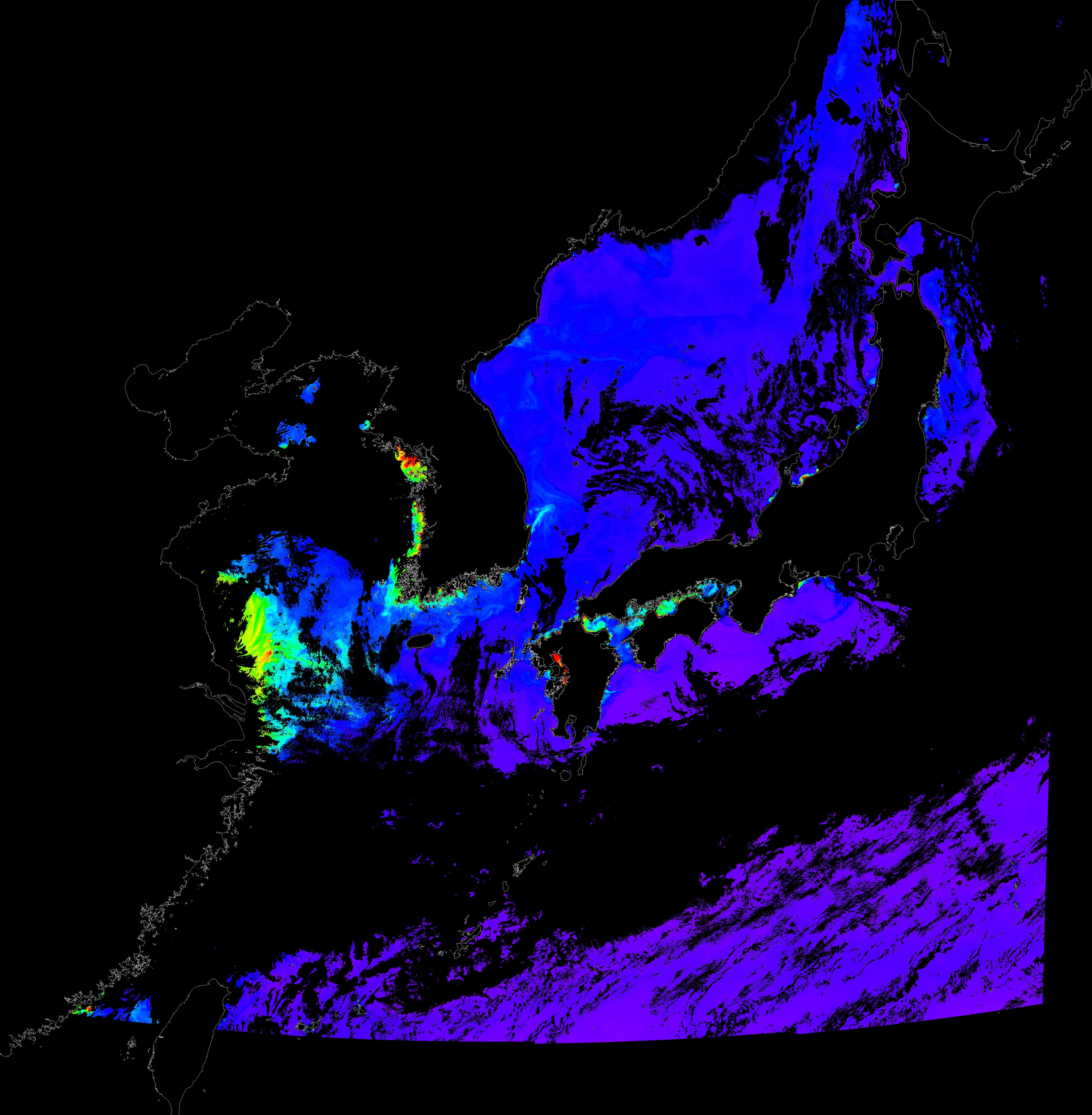 o 2017년 09월 08일 천리안 GOCI 클로로필 a 위성영상입니다. [ GOCI : Geostationary Ocean Color Imager ] o 농도분포는 하단 범례를 참고하시기 바랍니다. o 검은색은 구름을 나타냅니다.