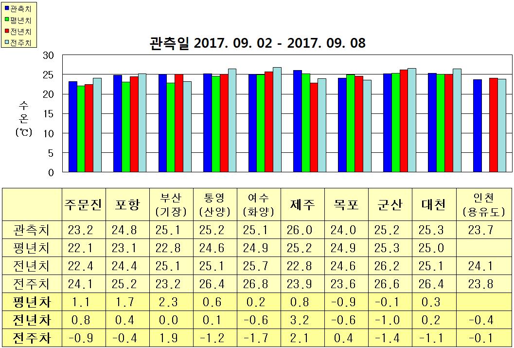 ○ 금주(2017. 09. 02 ~ 2017. 09. 08)의 한반도 연안 표면수온은 동해 연안역에서 섭씨 23~25도, 남해 연안역 25~26도, 서해 연안역에서 23.5~25.0도로 나타납니다. ○ 평년에 비해 동해 연안역은 1.0~2.5도 높게, 여수(화양) 비슷함을 제외한 남해 연안역은 0.5~1.0도 높게, 목포 0.5~1.0도 낮음을 제외한 서해 연안역은 비슷하게 나타납니다. ○ 전년에 비해 기장 비슷함을 제외한 동해 연안역은 0.5~1.0도 높게, 통영(산양) 비슷함, 제주 3.0~3.5도 높음을 제외한 남해 연안역은 0.5~1.0도 낮게, 대천 비슷함을 제외한 서해 연안역은 0.5~1.0도 낮게 나타납니다.