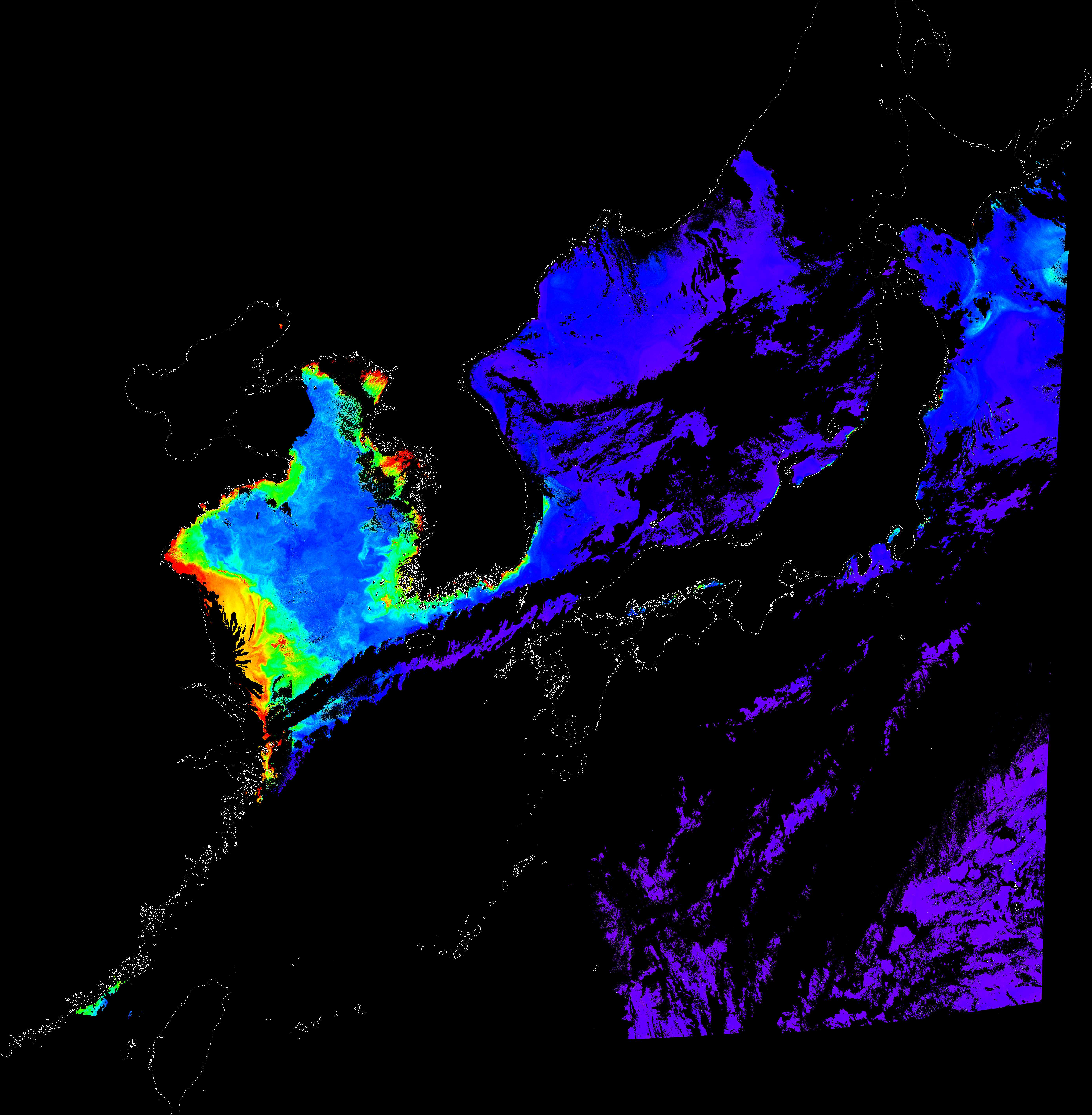 o 2017년 09월 13일 천리안 GOCI 클로로필 a 위성영상입니다. [ GOCI : Geostationary Ocean Color Imager ] o 농도분포는 하단 범례를 참고하시기 바랍니다. o 검은색은 구름을 나타냅니다.